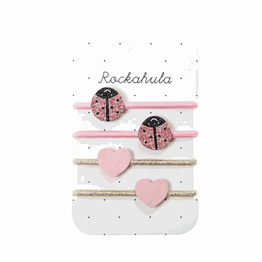 Fangen Sie den Liebeskäfer mit diesem Viererpack Marienkäfer-Glitzerponys! Zwei kleine Marienkäfer mit niedlichem Gesicht, rosa glitzernden Flügeln und schwarzen Punkten zieren rosa Gummibänder und zwei rosa Kunstlederherzen auf goldenen Gummibändern.