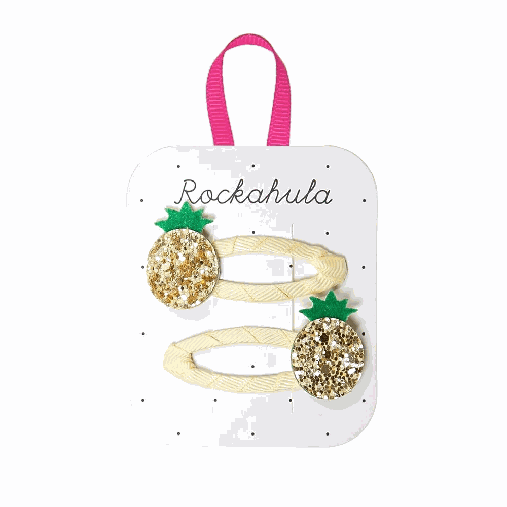 Spüren Sie die tropischen Vibes diesen Sommer mit unseren Ananas-Clips. Unsere goldenen Ananasse haben detaillierte grüne Kronen und sitzen auf zwei hellgelben, mit Ripsband umwickelten Druckknöpfen.
