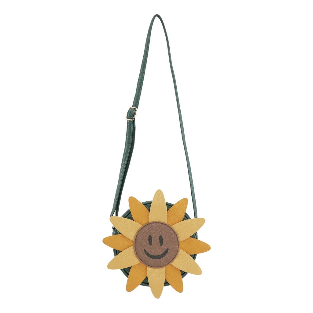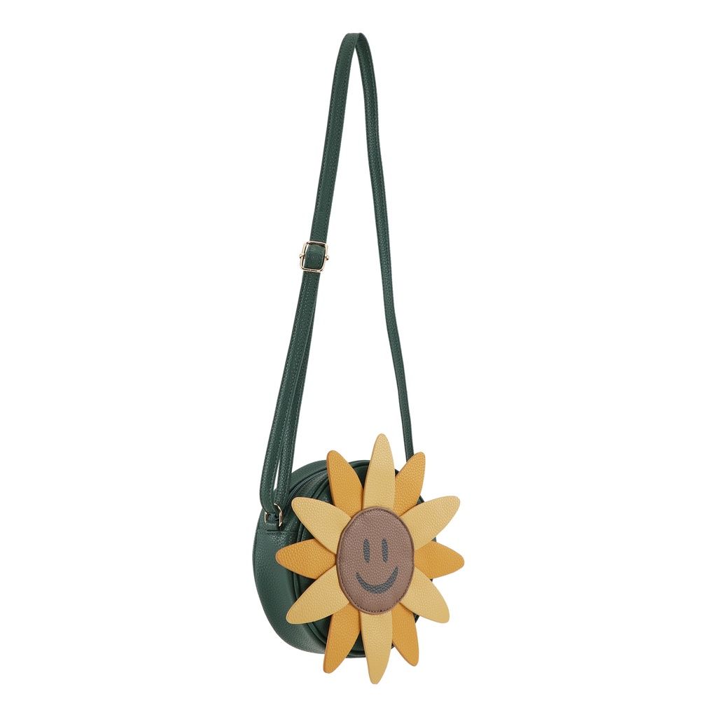 Umhängetasche in Grün mit einem süssen Motiv einer Sonnenblume auf der Vorderseite. Die Tasche hat einen verstellbaren Schulterriemen.