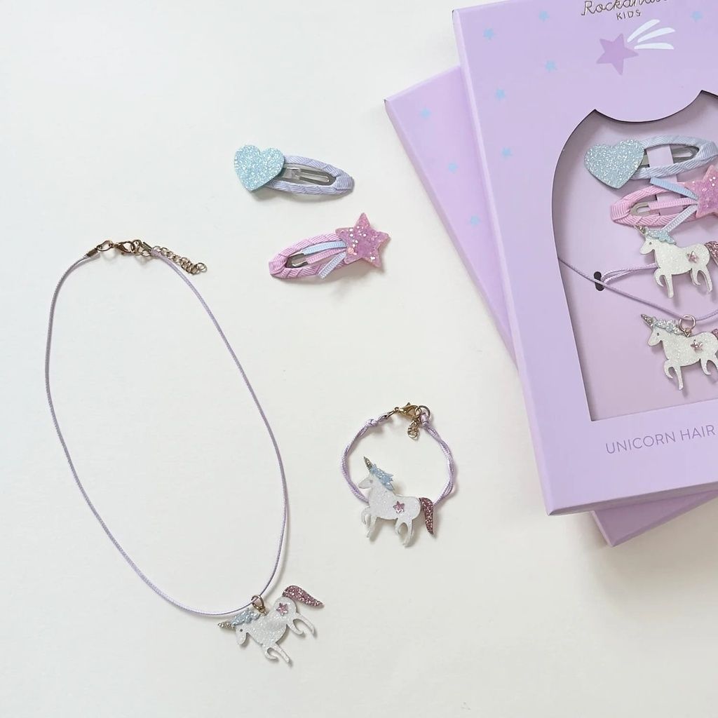 Unsere Einhorn-Haar- und Schmuck-Geschenkbox ist das perfekte Geschenk! Das Set besteht aus zwei Haarspangen mit Sternschnuppe und Herz sowie einer wunderschön glitzernden Einhorn-Halskette und einem Einhorn-Armband und ist in einer Geschenkbox verpackt, die die perfekte Grösse für einen Briefkasten hat!