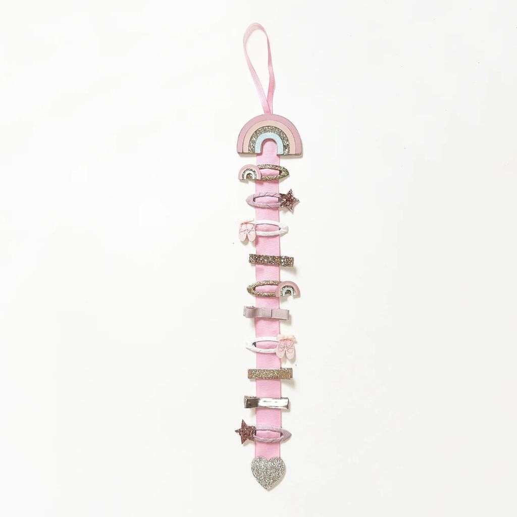 Die perfekte Lösung, um Haarspangen an einem Ort aufzubewahren und zu organisieren - unser Spangenbügel hat eine Aufhängeschlaufe, die an eine Tür oder einen Wandhaken gehängt werden kann. Hängen Sie Ihre Clips einfach auf, um sie beim nächsten Mal wieder zu tragen!
