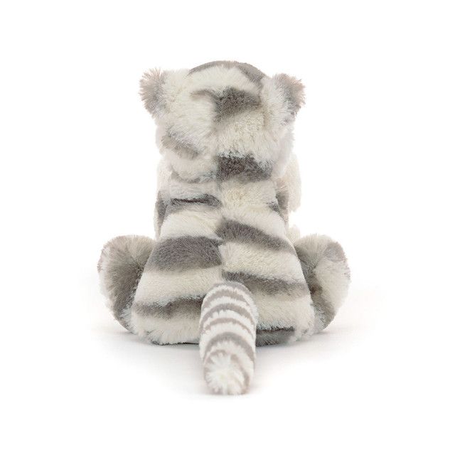 Hält der Tiger eine Schneewehe? Nein, es ist der Schnuller Bashful Snow Tiger! Diese kleine grosse Katze hat graue und cremefarbene Streifen, eine Kieselsteinnase und einen langen, rauschenden Schwanz, und sie hat sich auf eine weiche, vanillefarbene Felldecke gestürzt!
