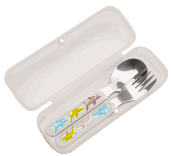 Kinder Besteck Set "Smiley Shark" für kleine Entdecker. Dieses Set umfasst eine Gabel und einen Löffel, jeweils mit lustigen Smiley Shark-Motiven verziert. Hergestellt aus robustem, kinderfreundlichem Material, ist das Besteck sicher und leicht zu handhaben. Das fröhliche Design macht jede Mahlzeit zu einem Vergnügen und fördert selbstständiges Essen. Perfekt für den täglichen Gebrauch und ideal als Geschenk für kleine Haifisch-Fans.