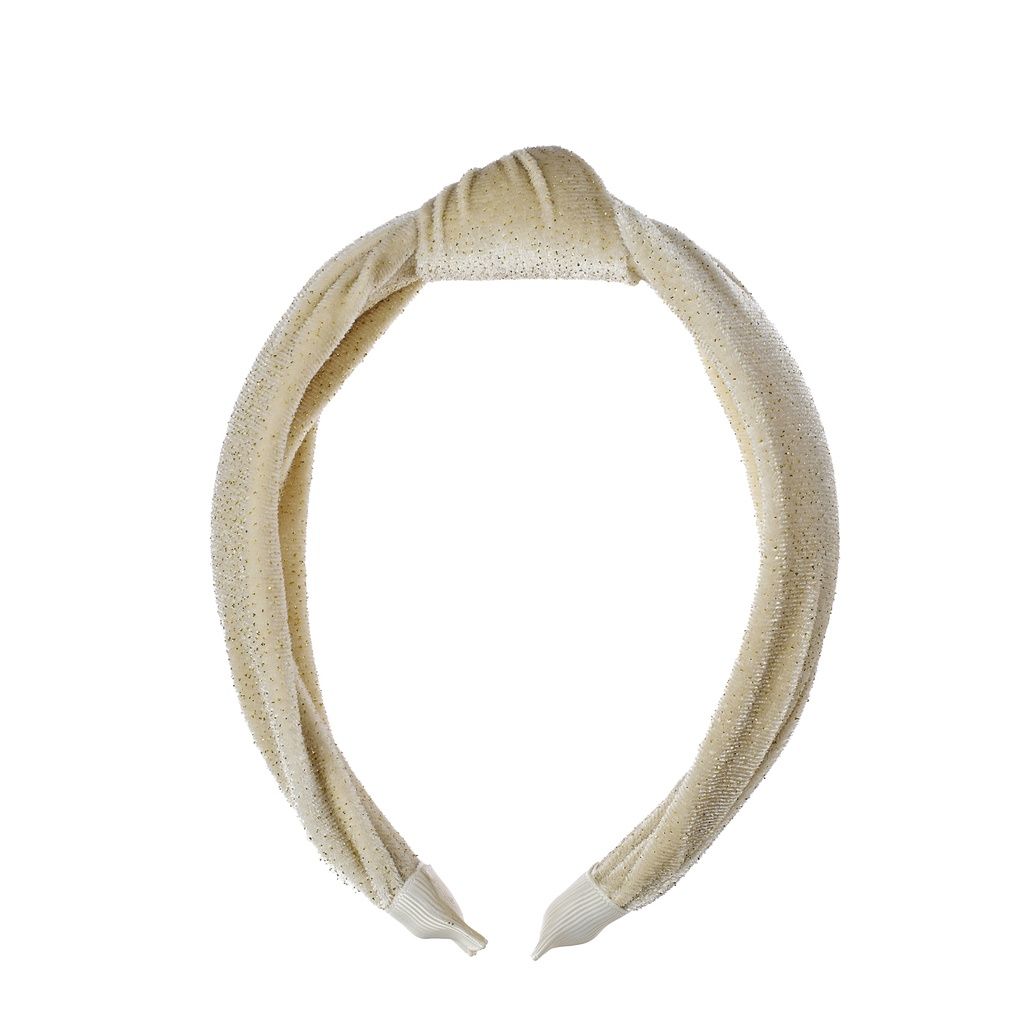 Unser wunderschönes, funkelndes Samt-Haarband ist mit einem eleganten Knoten-Detail versehen und von zartem Schimmer durchzogen! Gefertigt aus weichstem Samt in Elfenbein und mit Ripsband umwickelten Enden sorgt es für einen besonders angenehmen Sitz auf kleinen Köpfen. Ein echtes Must-have für festliche Anlässe und Partys!