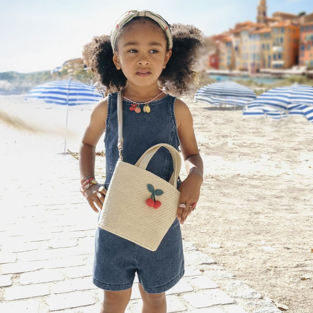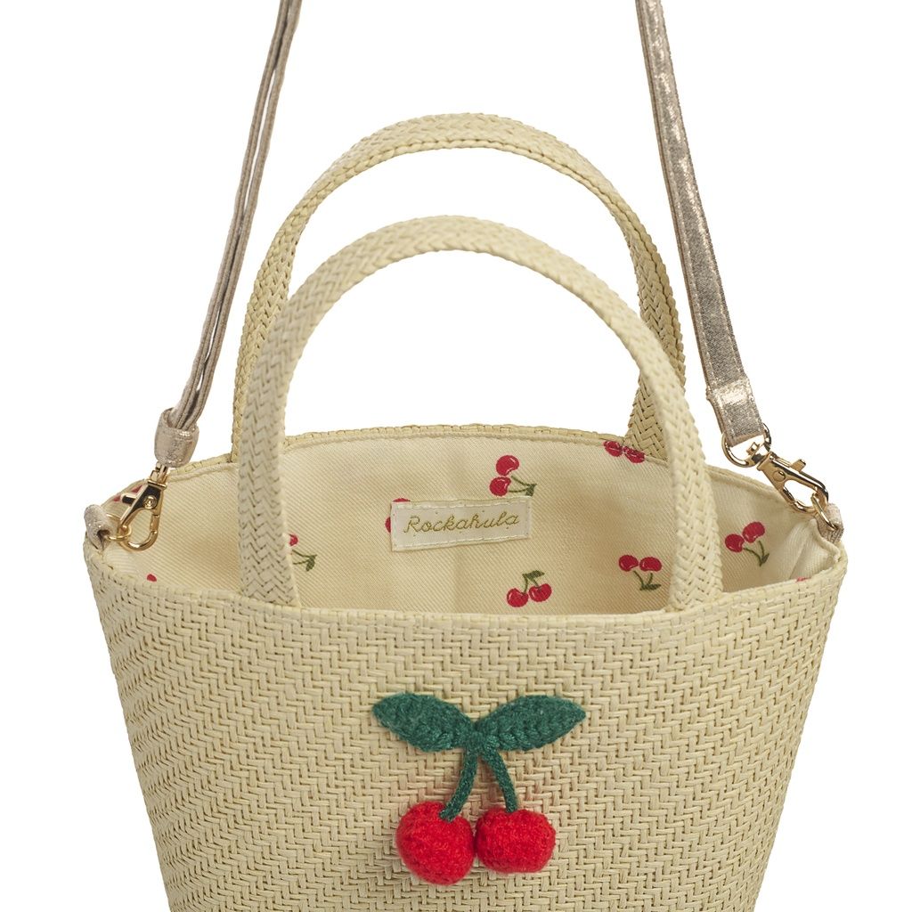Diese liebevoll gestaltete Korbtasche von Rockahula ist das perfekte Accessoire für sonnige Tage. Gefertigt aus gewebter Raffia und verziert mit einer gehäkelten Kirsche, bringt sie natürlichen Charme und verspielte Details in den Alltag Ihres Kindes.