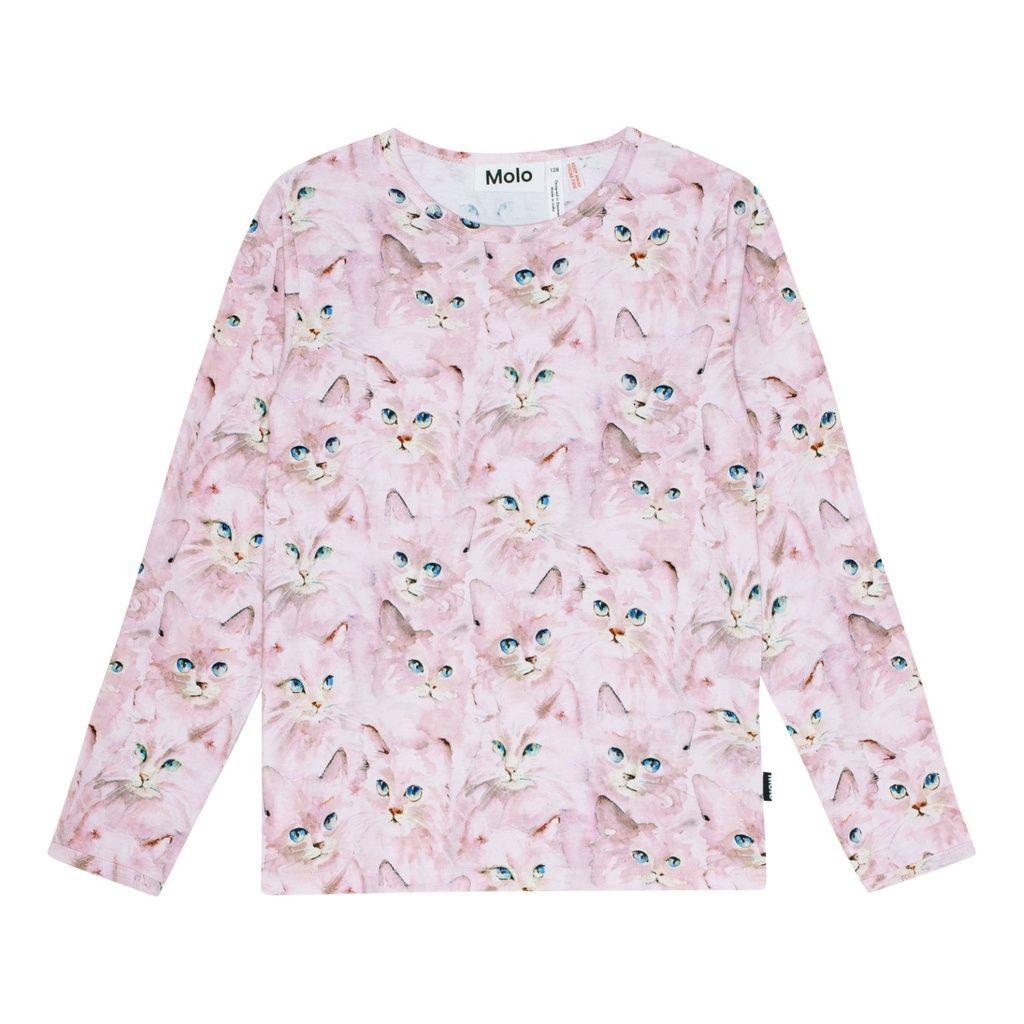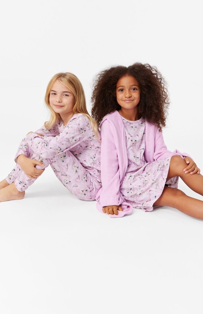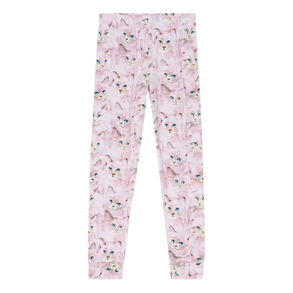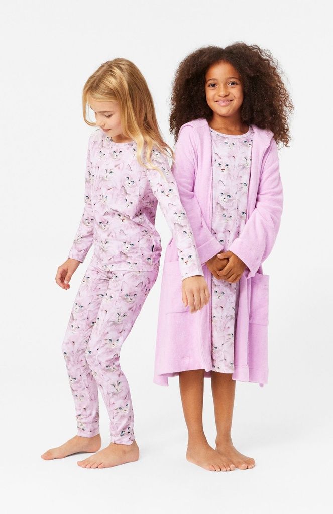 Lila Pyjama-Set aus Öko-Baumwolle mit einem elastischen Bund und gerippten Bündchen an den Knöcheln. Das Oberteil hat einen Rundhalsausschnitt. Das Set hat ein niedliches all-over Katzenmuster.