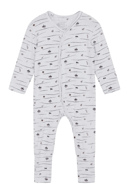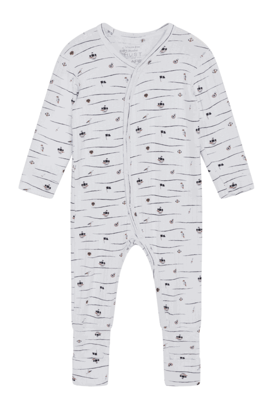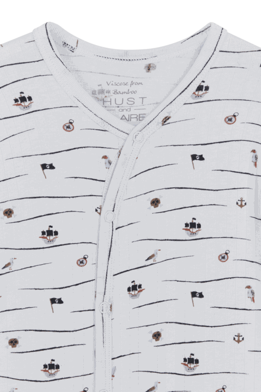 Langärmeliger Einteiler aus weicher, dehnbarer Viskose aus Bambus mit einem Piraten-Print. Dieser Einteiler kann dank dem asymmetrischen Knopfverschluss, der vom Hals bis zum linken Fuss verläuft, leichter geknöpft werden.