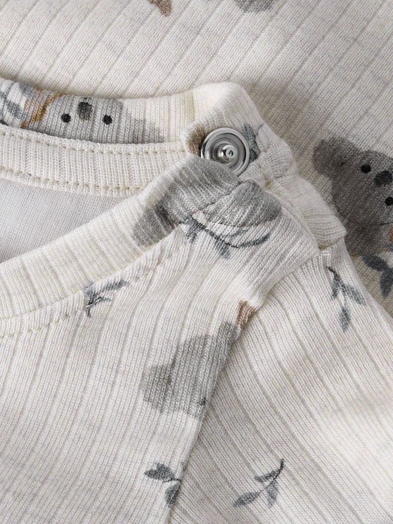 Der gerippte Strick mit feinem Längsstreifenmuster bietet eine angenehme Elastizität und sorgt für ein weiches, anschmiegsames Tragegefühl. Das Hauptmaterial besteht zu mindestens 50 % aus Bio-Baumwolle und ist besonders hautfreundlich. Der Allover-Print verleiht dem Body eine moderne, kindgerechte Optik.