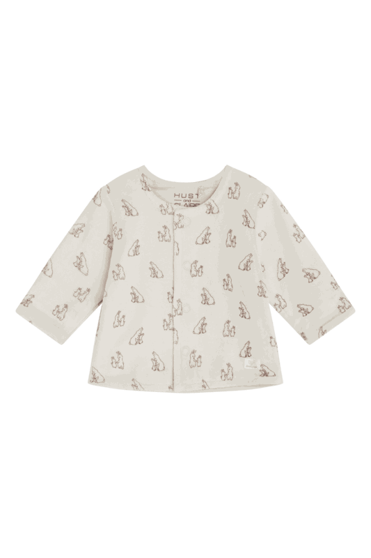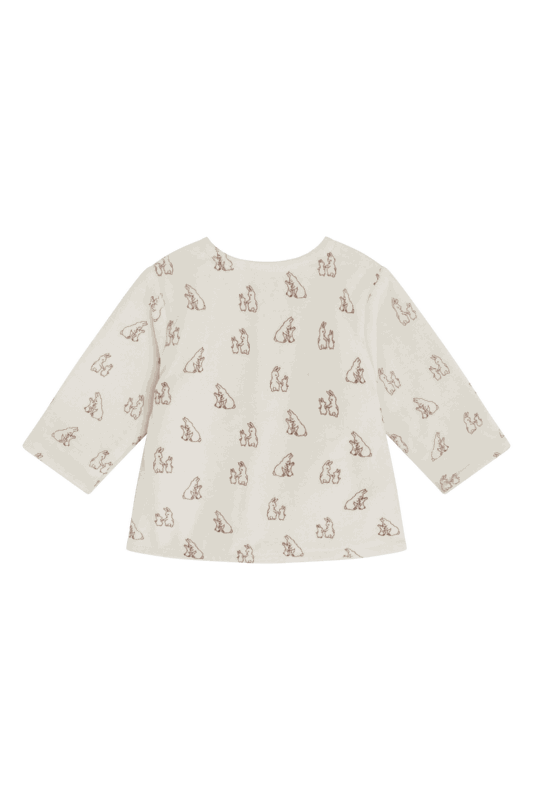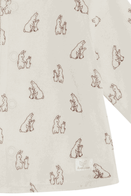 Gefütterter Cardigan aus weichem Velours mit Kaninchen-Print. Dieses Modell wird vorne mithilfe von Druckknöpfen geschlossen.