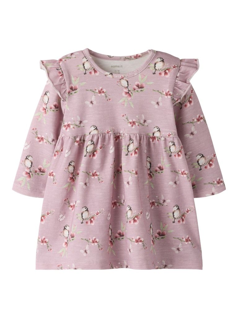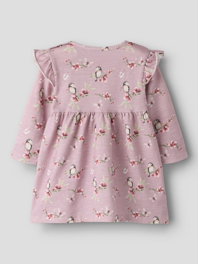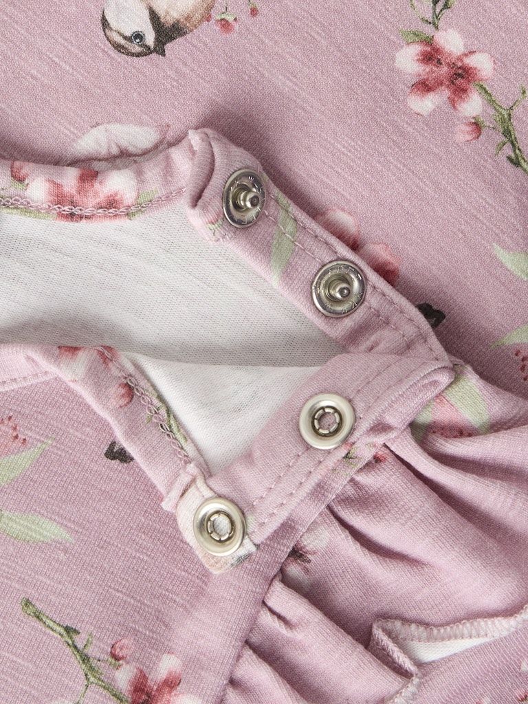 Der leichte, dehnbare Jersey-Stoff fühlt sich weich auf der Haut an und sorgt für ein angenehmes Tragegefühl. Lange Ärmel und der klassische Rundhalsausschnitt machen das Kleid zeitlos und vielseitig. Die Rüschen-Details setzen einen hübschen Akzent, während der All-over-Print dem Design eine fröhliche Note verleiht. Dank Druckknopfverschluss an der Schulter gelingt das An- und Ausziehen besonders unkompliziert.