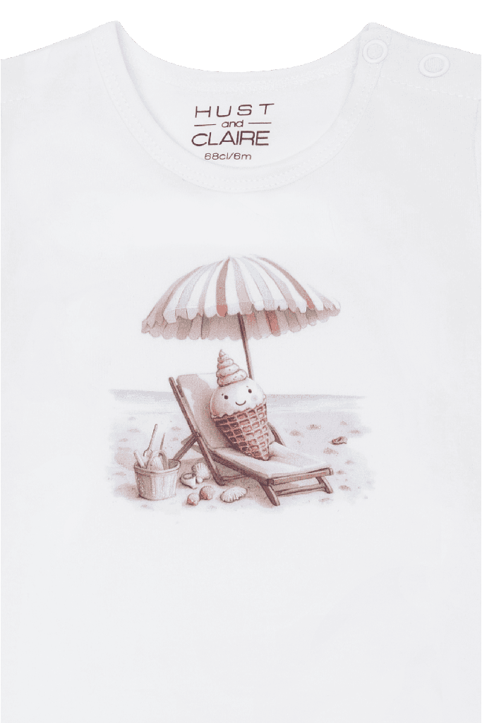 Der Hust & Claire Body HCBritt Sunny begeistert mit einem fröhlichen Sommerdesign und höchstem Tragekomfort für die Kleinsten. Das verspielte Eis-Motiv mit liebevoller Strandszene sorgt für einen frischen, kindgerechten Look und macht den Body zu einem echten Hingucker an warmen Tagen.