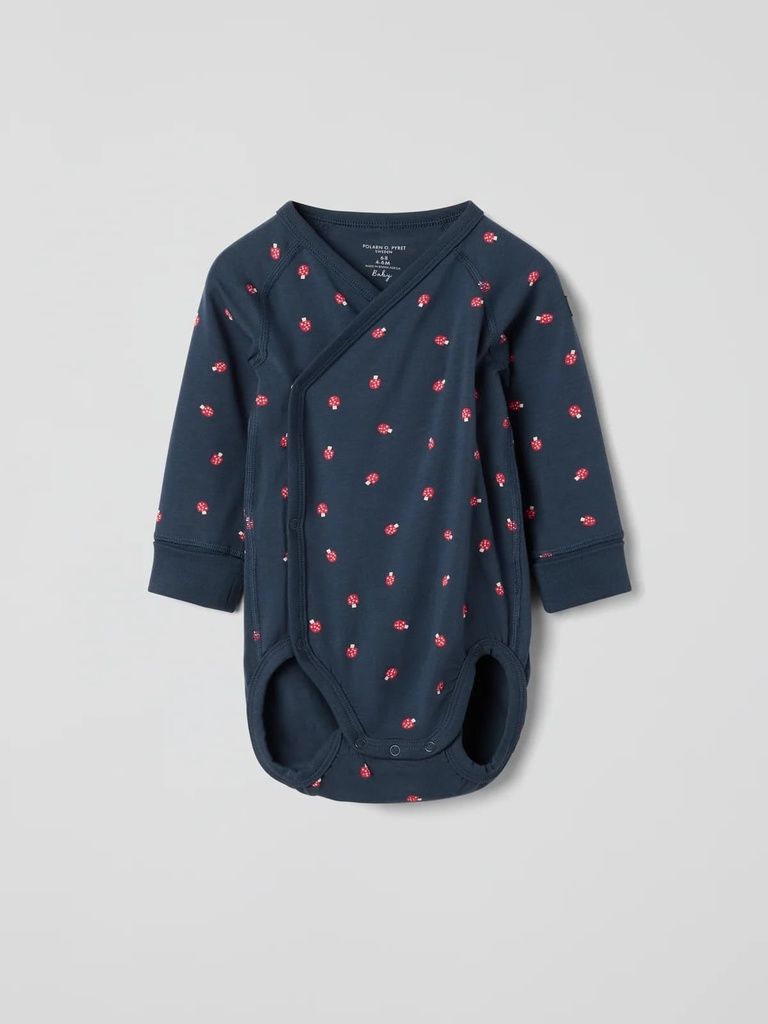 Verlängerbarer Wickelbody aus 100 % Bio-Baumwolle mit Druckknöpfen entlang der Wickelöffnung, umschlagbaren Bündchen und regulierbarem Schrittbereich. Nachhaltig, bequem und hautfreundlich für wachsende Babys.