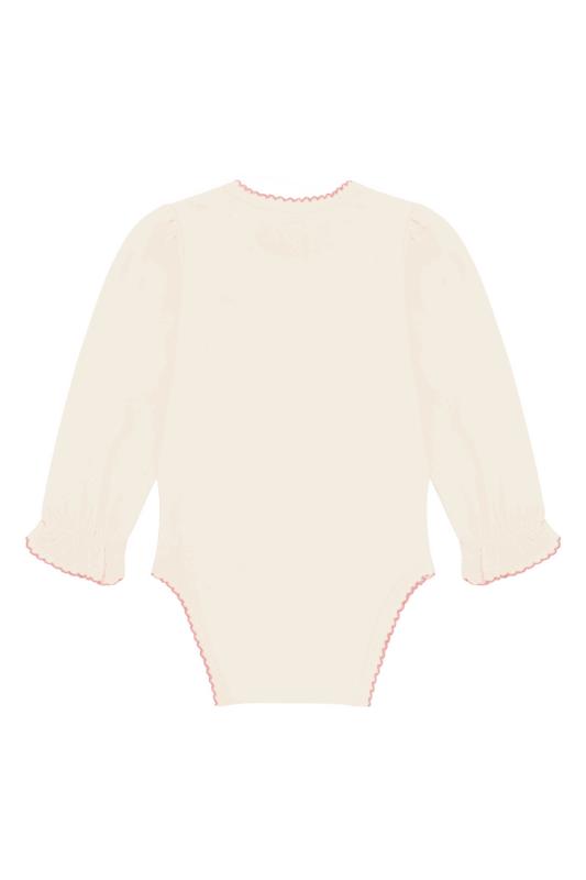Die weiche, atmungsaktive Qualität sorgt für ein angenehmes Tragegefühl auf empfindlicher Babyhaut. Druckknöpfe an der Schulter sowie im Schritt erleichtern das An- und Ausziehen und machen das Wickeln unkompliziert. Elastische Armabschlüsse mit kleiner Rüsche bieten zusätzlichen Komfort und runden das Design stilvoll ab.