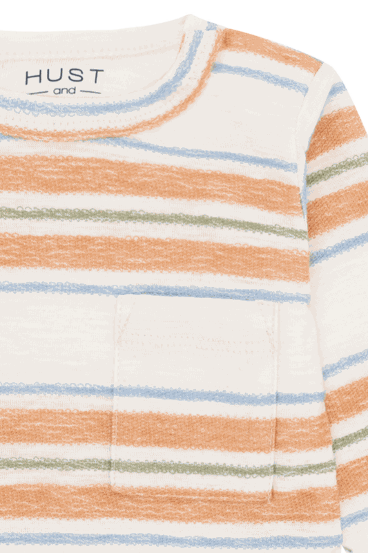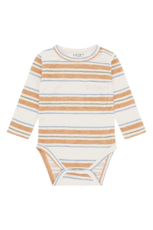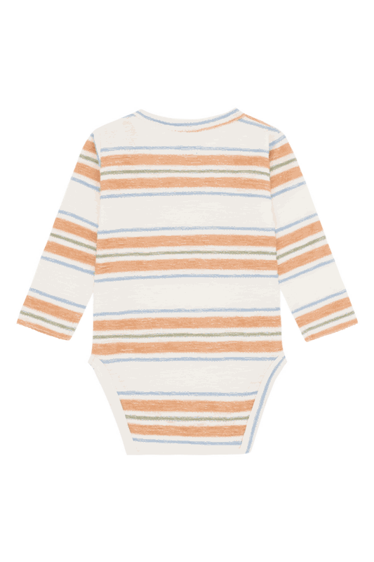 Das klassische Streifenmuster verleiht dem Body einen frischen, zeitlosen Look. Praktische Druckknöpfe am Rücken und im Schritt erleichtern das An- und Ausziehen, sodass der Body besonders alltagstauglich ist. Eine dekorative Tasche auf Brusthöhe rundet das Design liebevoll ab.
