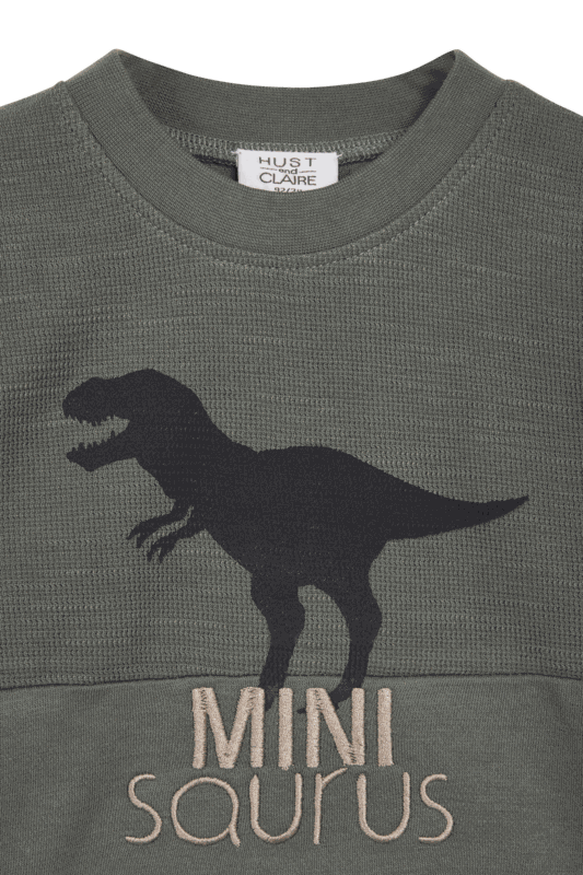 Langarmshirt aus weicher Baumwolle mit einem Dinosaurier-Motiv auf der Brust und der aufgestickten Aufschrift "Mini saurus" auf dem Bauch. Dieses Modell hat bei den Grössen 56 bis 80 einen Knopfverschluss auf der linken Schulter.