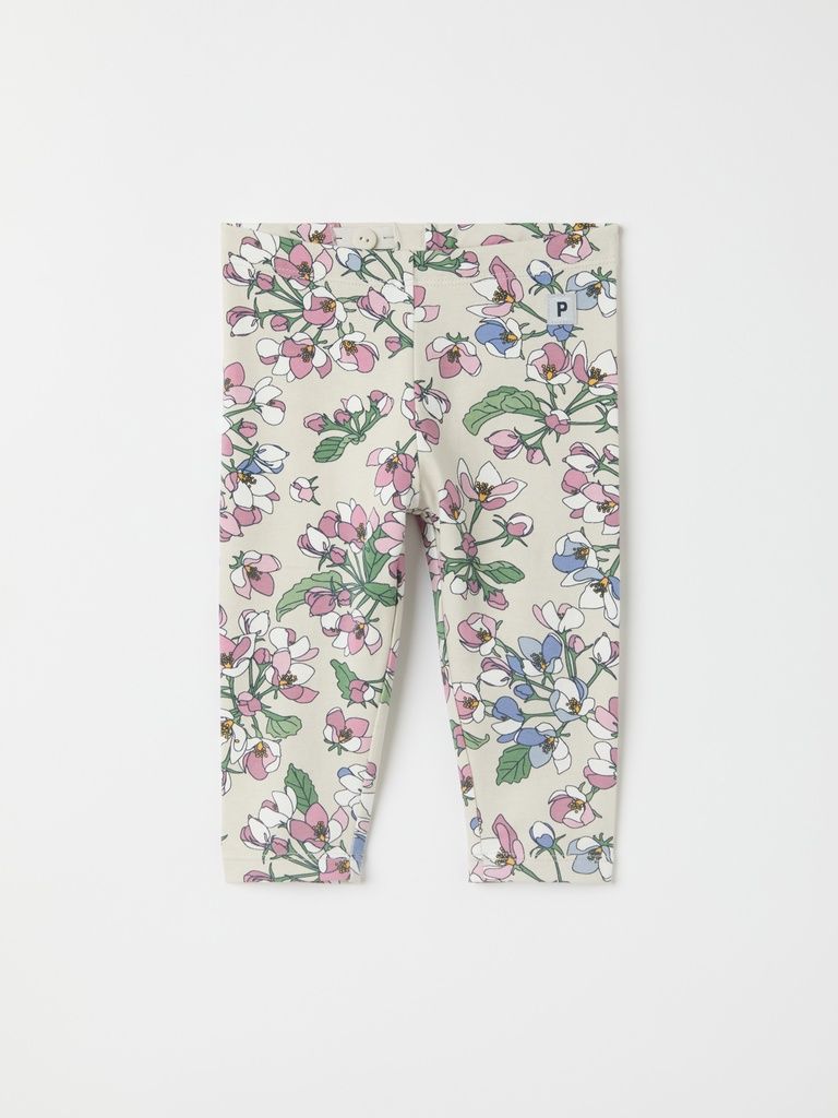 Die durchgehend mit Blümchen bedruckten Leggings haben einen Bund, der mit Knopflochgummi reguliert werden kann.