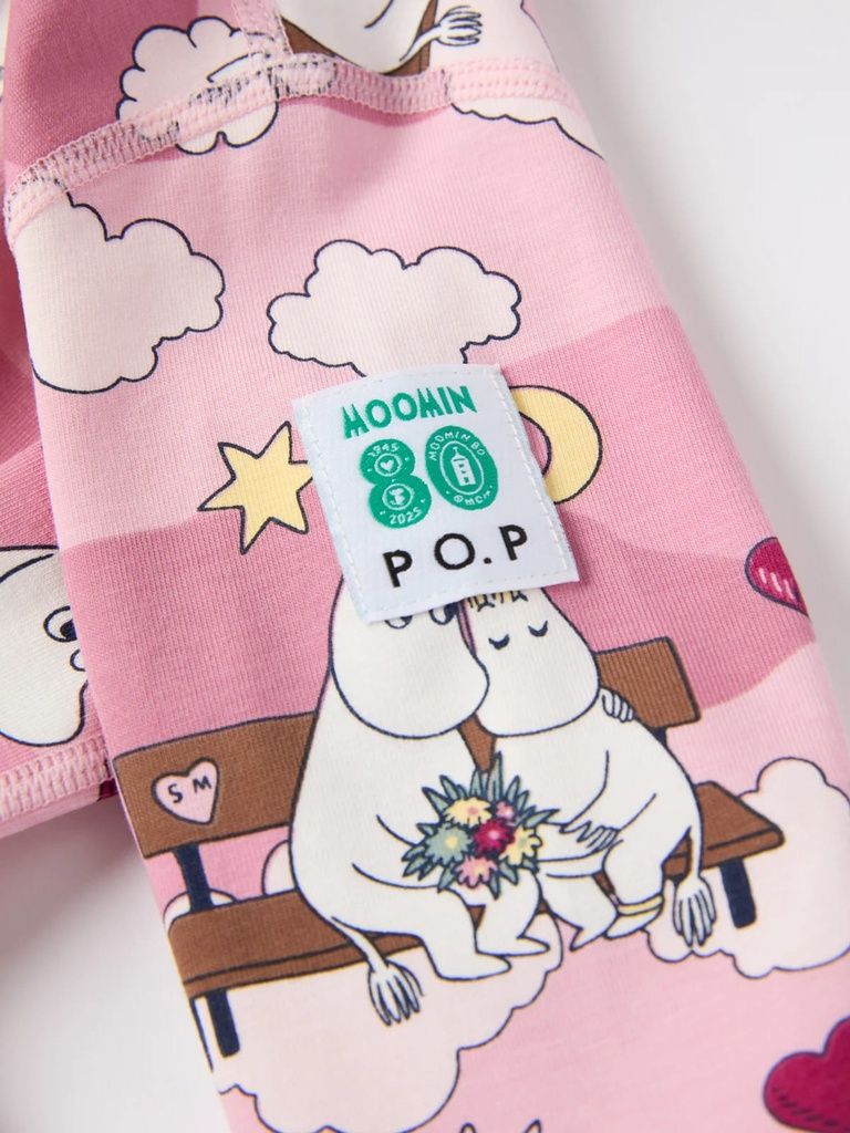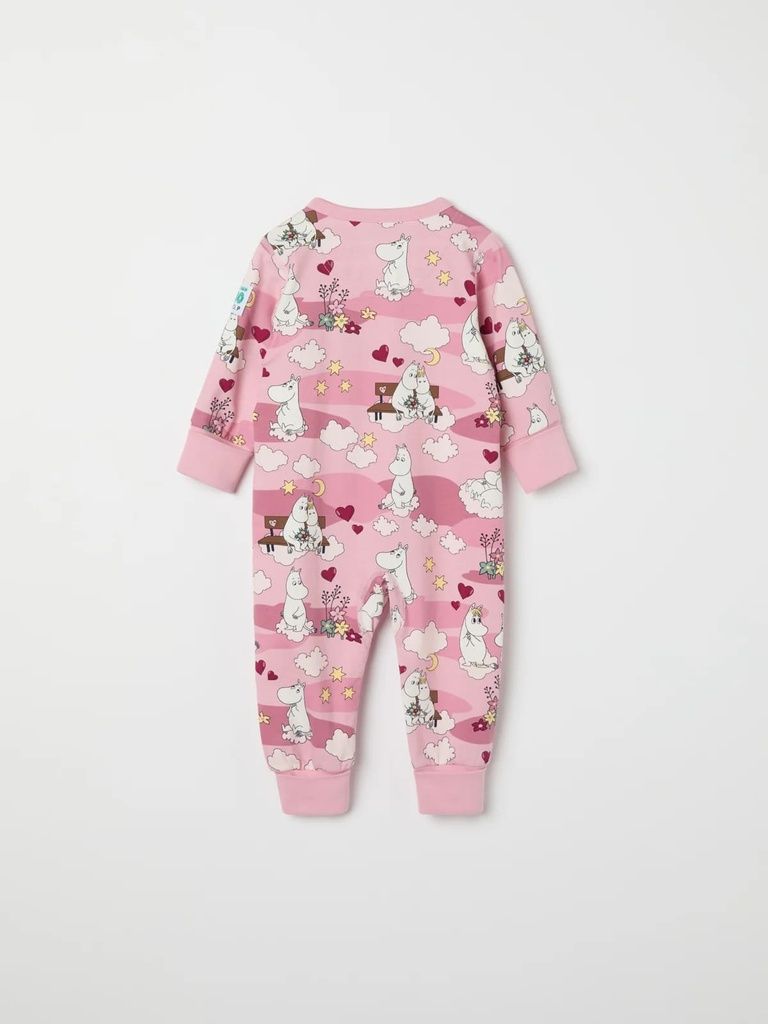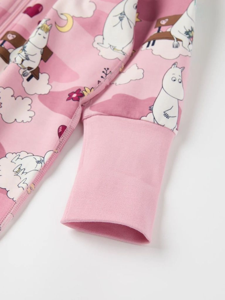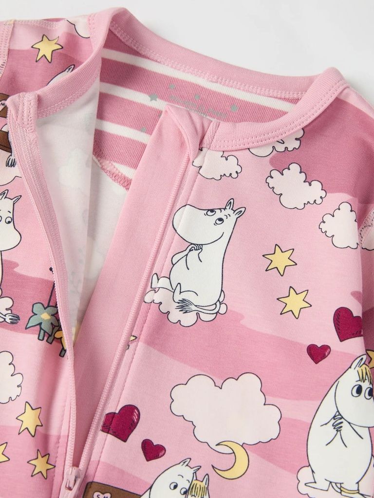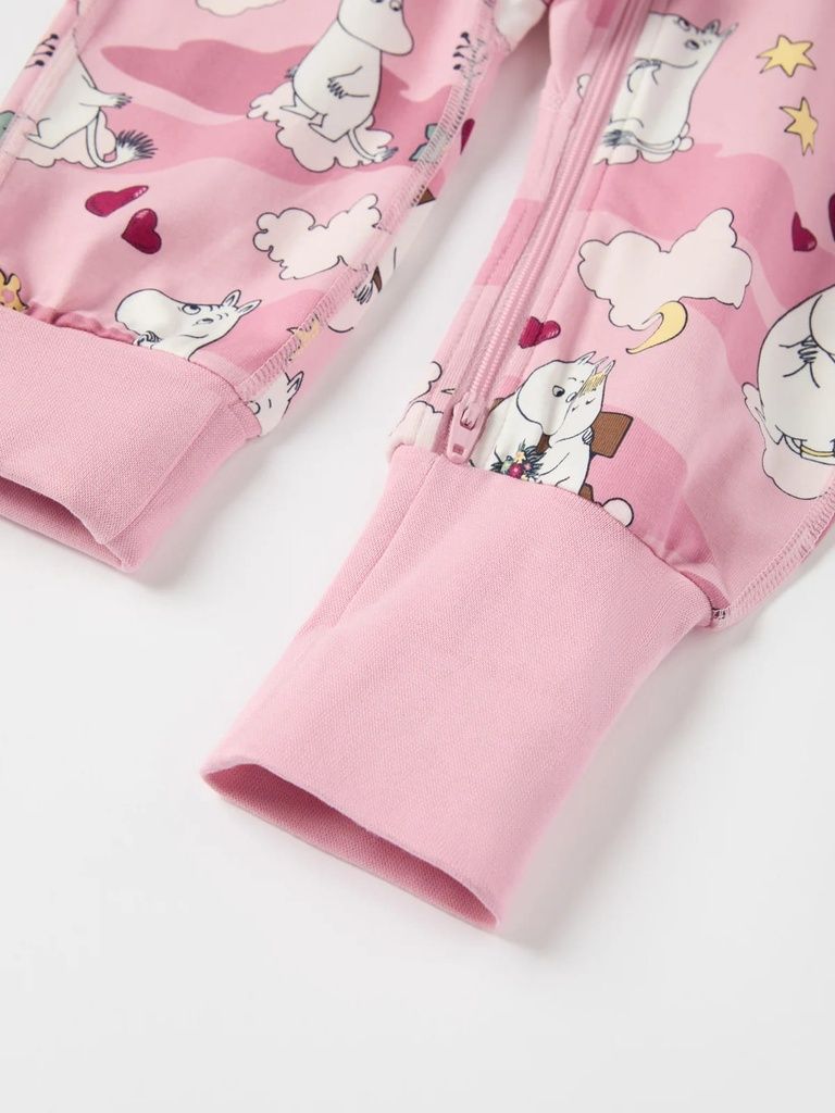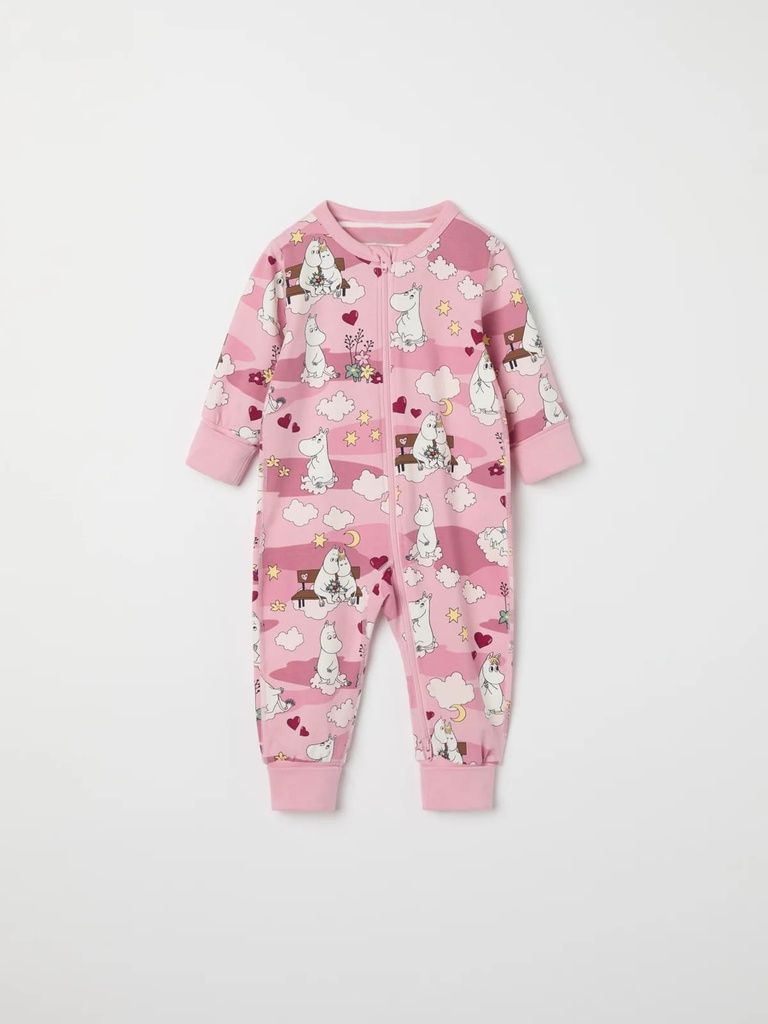 Der Overall ist durchgehend mit den Mumintrollen von Tove Jansson bedruckt.