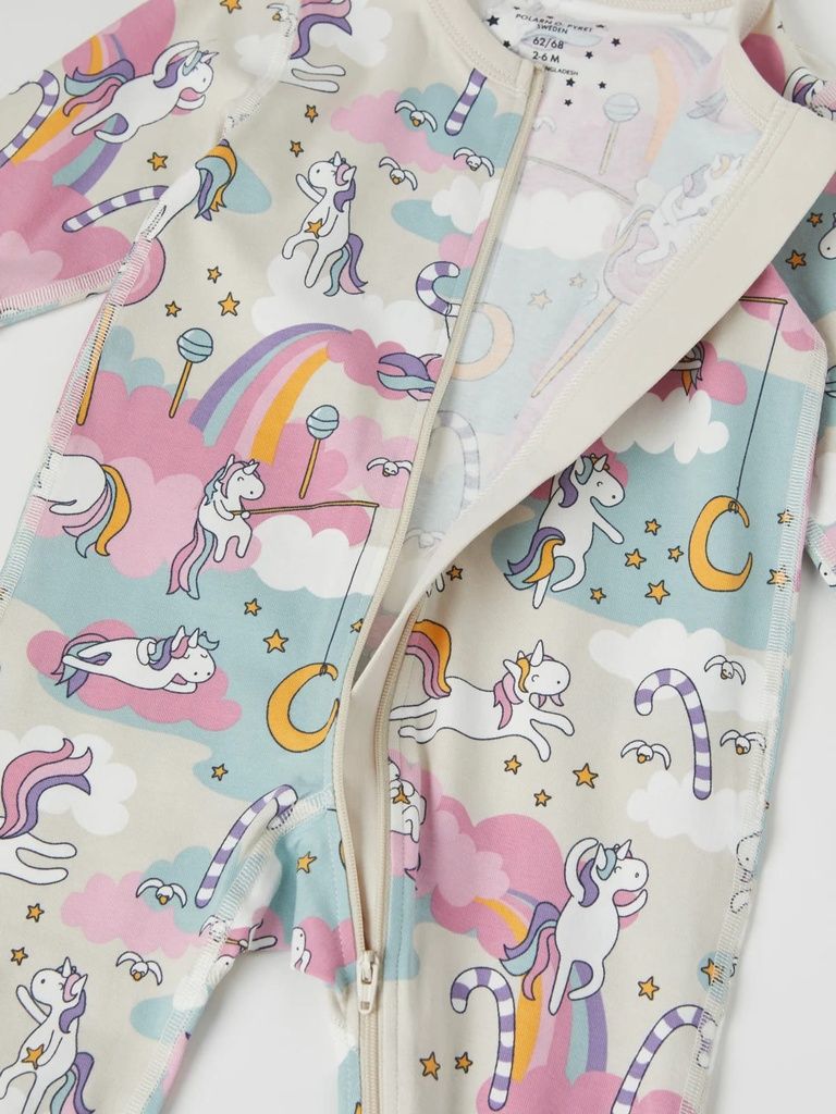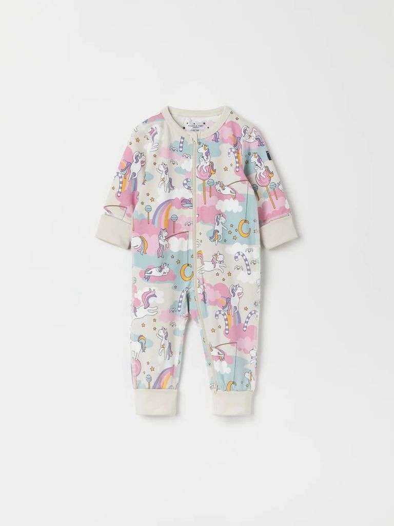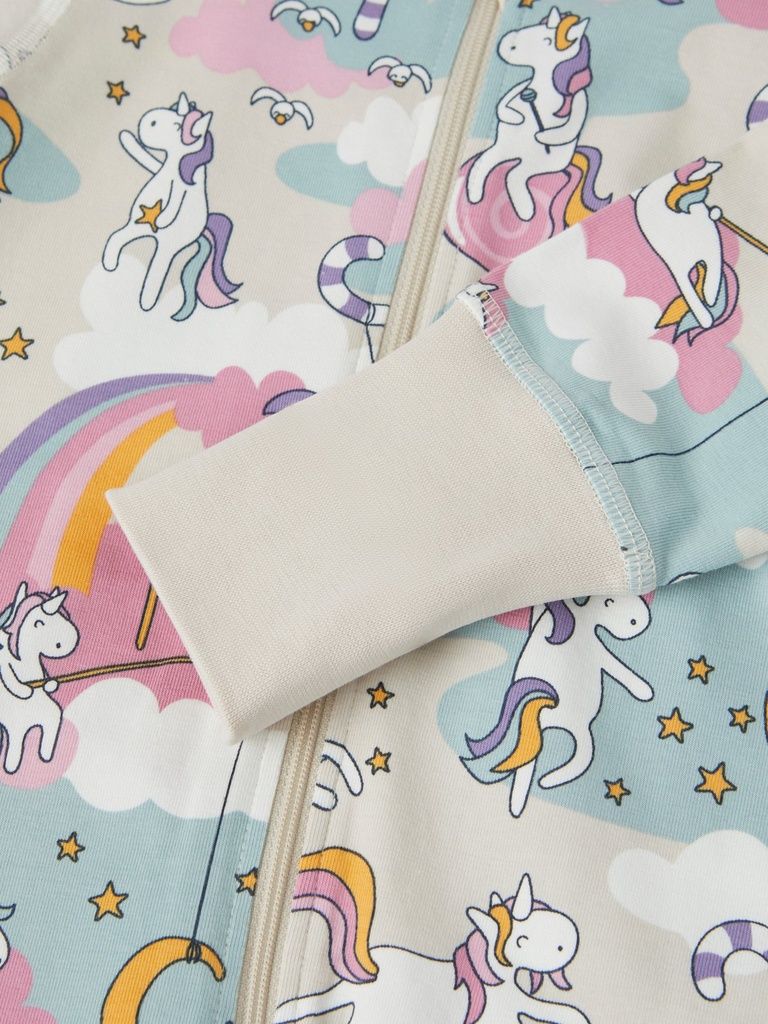 Der Overall ist durchgehend mit Einhörnern und rosa Wolken bedruckt. Die extra