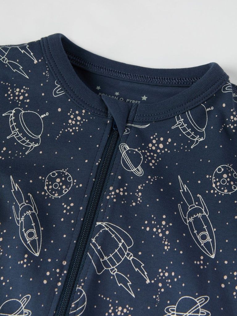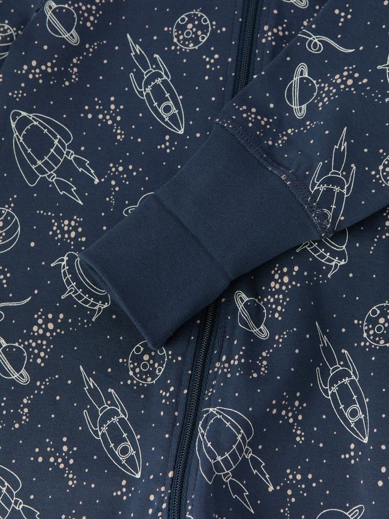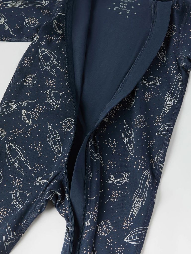 Der Overall ist durchgehend mit Raumschiffen bedruckt.