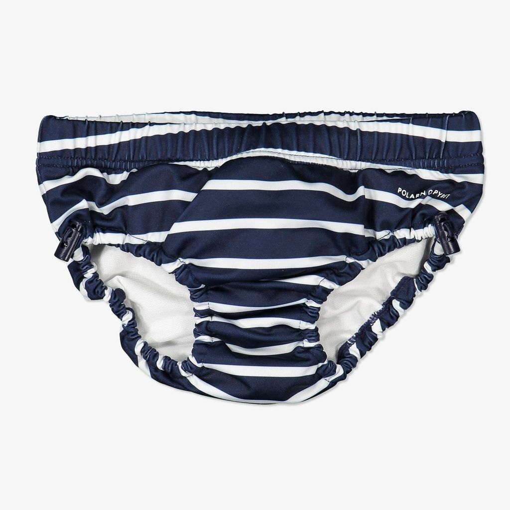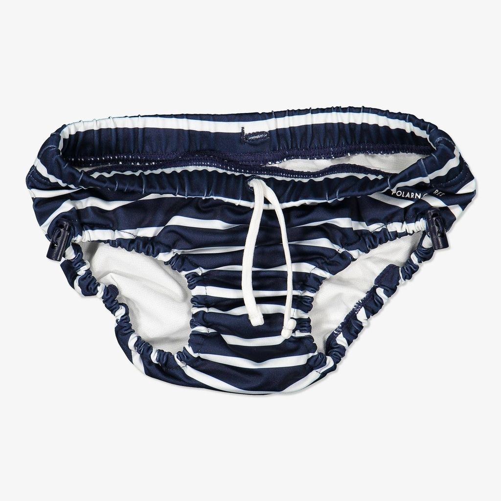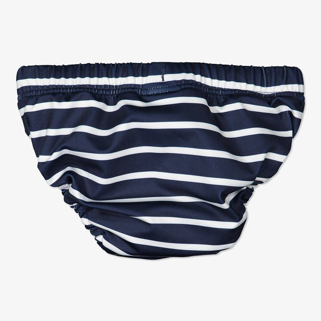 Gestreiftes Badehöschen aus recyceltem Material, das sich perfekt zum Babyschwimmen eignet, da kleine Unfälle durch das zusätzliche Futter aufgefangen werden.