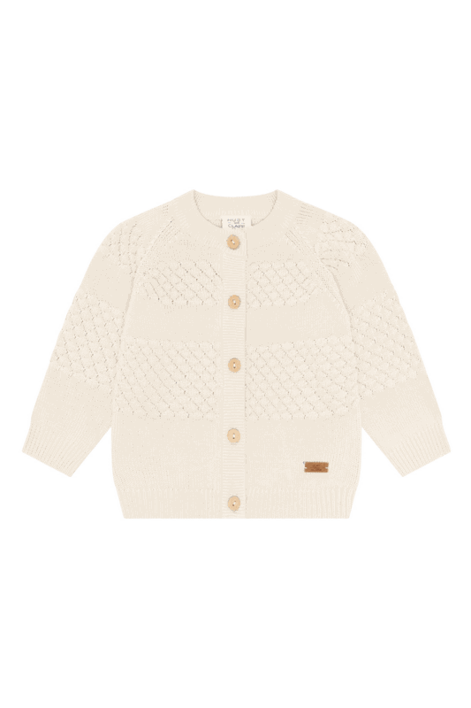 Die praktische Knopfleiste vorne erleichtert das An- und Ausziehen, selbst bei den Kleinsten. Ideal für kühlere Tage, Übergangszeiten oder als leichte Zwischenschicht über Body und Shirt. In warmem Cremeton gehalten, lässt sich das Strickjäckchen vielseitig kombinieren und wird schnell zum Lieblingsstück für jeden Tag.
