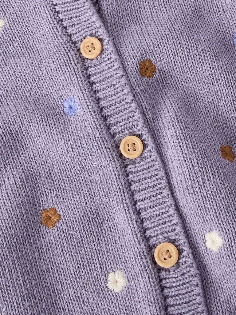Zarte Stickereien setzen verspielte Akzente und machen die Strickjacke zu einem echten Lieblingsstück für stilvolle Alltagslooks.
