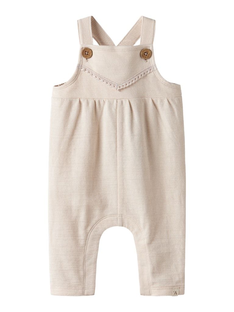 Der Overall verfügt über abnehmbare Träger, eine Knopfleiste und Druckknöpfe im Schritt, die das An- und Ausziehen erleichtern. Feine Spitzen-Details verleihen dem Stück einen verspielten, charmanten Look, während die lockere Passform für Bewegungsfreiheit und Komfort sorgt.