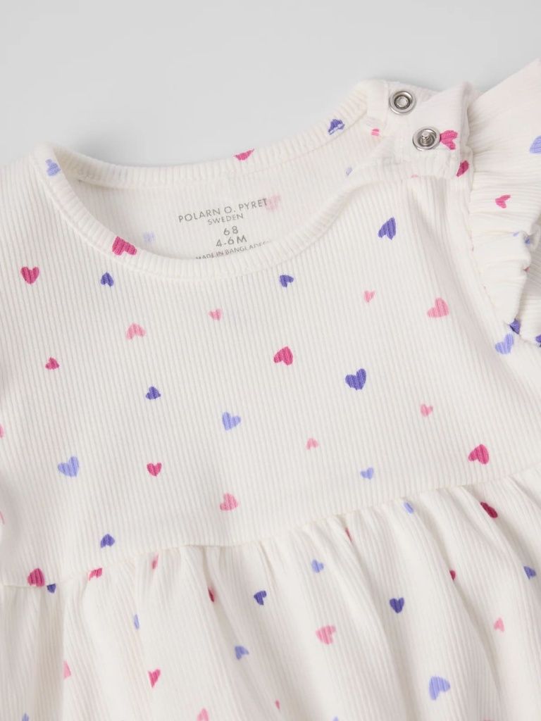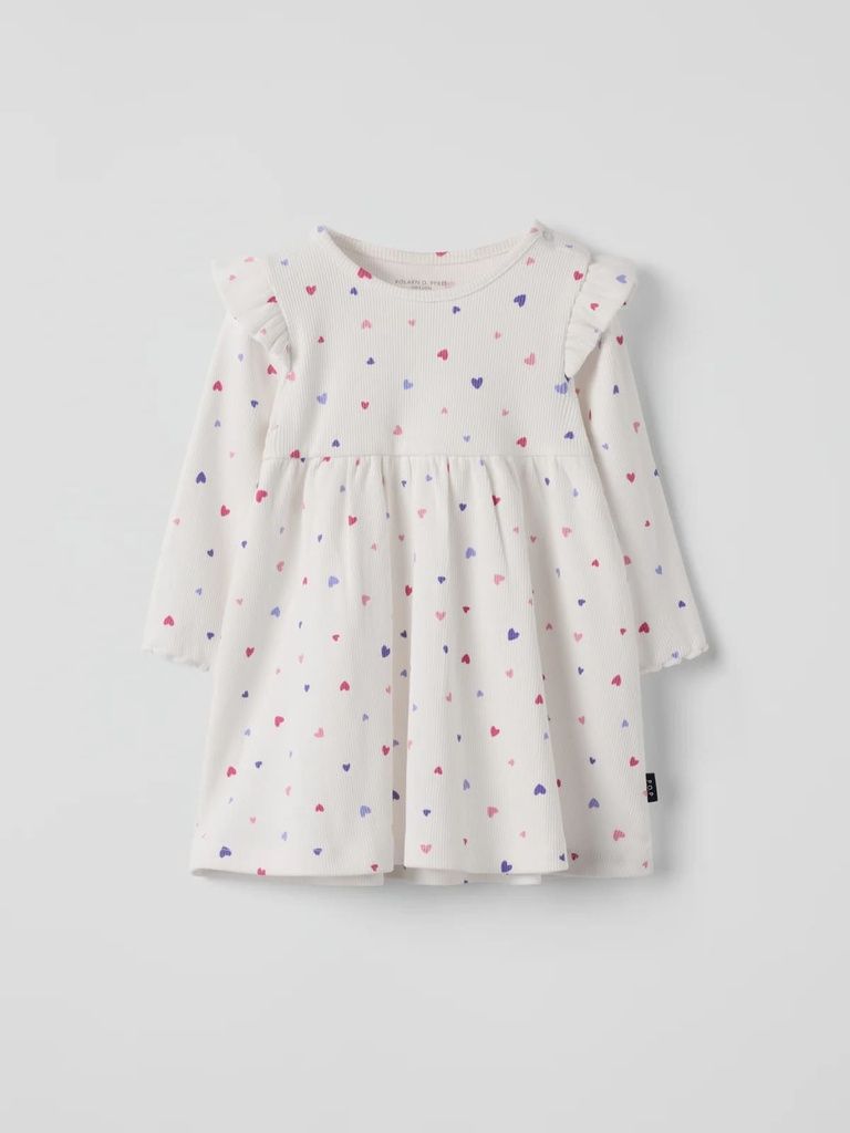 Dieses weiche, gerippte Babykleid aus 100 % Bio-Baumwolle ist das perfekte Kleidungsstück für festliche Anlässe oder den Alltag. Rundum mit kleinen Herzchen gemustert und mit zarten Rüschen an den Schultern versehen, vereint es Komfort und niedliches Design.