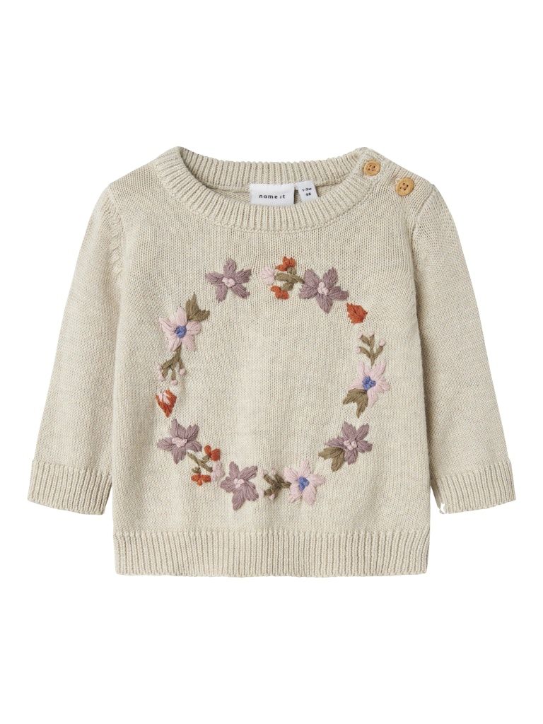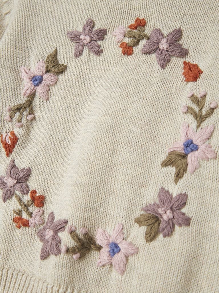 Der Pullover ist normal geschnitten, verfügt über einen Rundhalsausschnitt, lange Ärmel und eine praktische Knopfleiste. Dezente Stickereien verleihen dem Pullover liebevolle Details, die den Look abrunden.