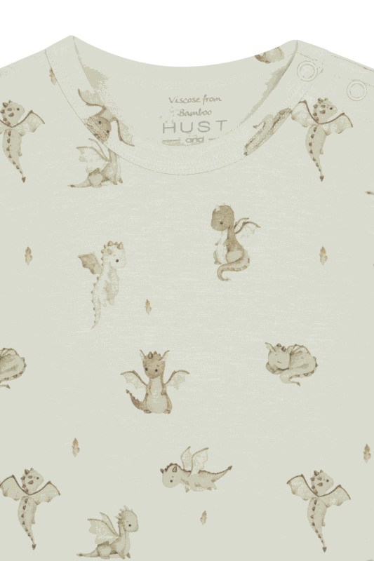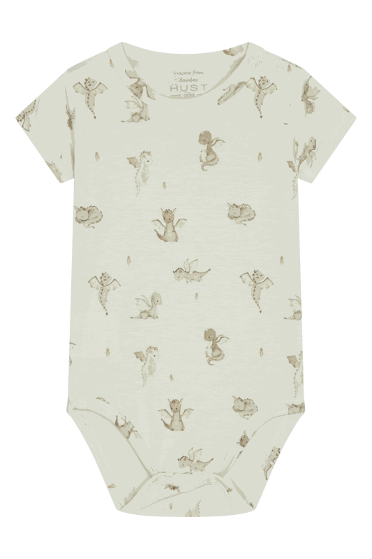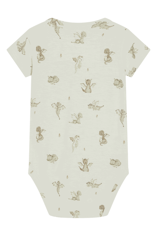 Kurzärmeliger Body aus weicher, dehnbarer Viskose aus Bambus mit einem Dinosaurier-Print. Es ist an der linken Schulter und zwischen den Beinen mit Knopfverschlüssen ausgestattet.