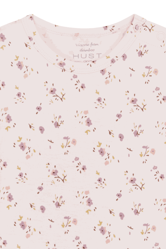 Langärmeliger Body aus weicher, dehnbarer Viskose aus Bambus mit einem Blumenprint. Es ist an der linken Schulter und zwischen den Beinen mit Knopfverschlüssen ausgestattet.