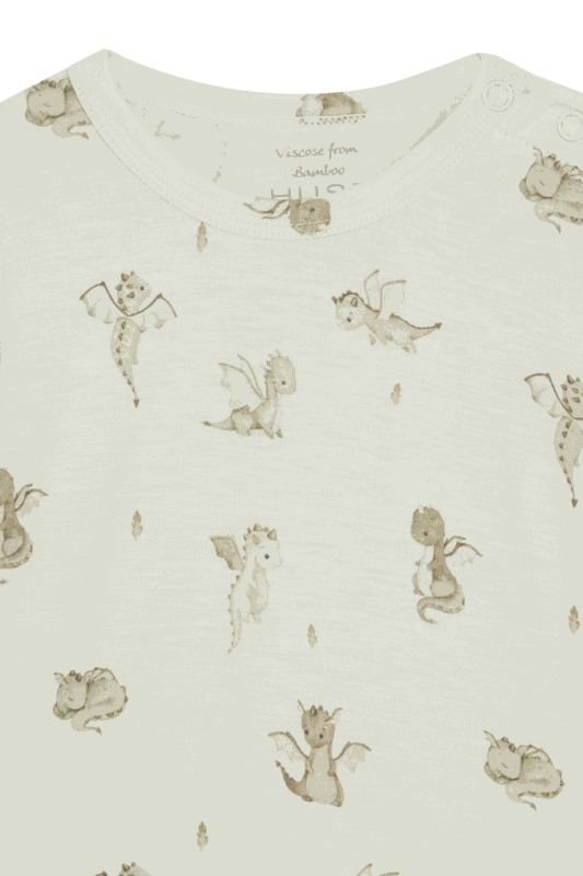 Langärmeliger Body aus weicher, dehnbarer Viskose aus Bambus mit einem Dinosaurier-Print. Es ist an der linken Schulter und zwischen den Beinen mit Knopfverschlüssen ausgestattet.