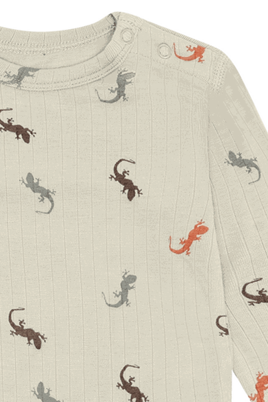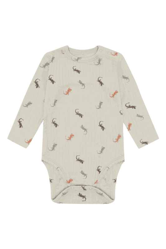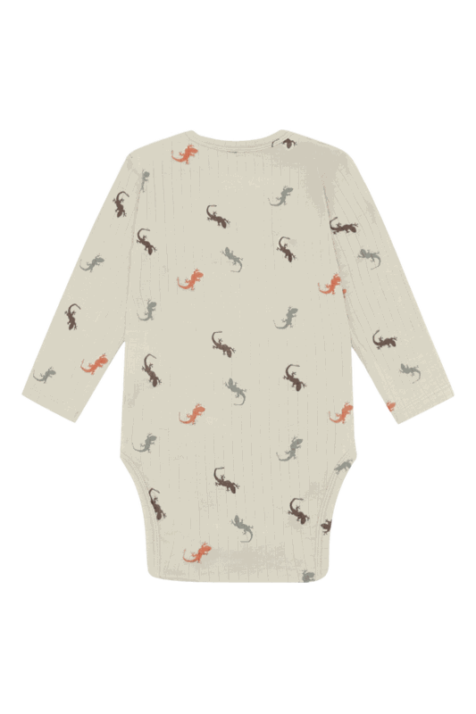 Der langärmelige Body begeistert mit einem süssen Eidechsenprint und feinen gerippten Details, die dem Design eine besondere Note verleihen. Dank der praktischen Druckknöpfe an der Schulter sowie im Windelbereich lässt er sich mühelos an- und ausziehen - ideal für unkomplizierte Wickelmomente.