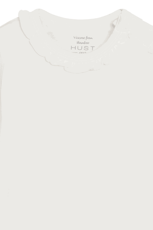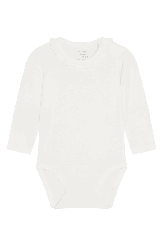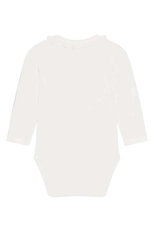 Langärmeliger Body aus weicher, dehnbarer Viskose aus Bambus mit einem Rüschenkragen. Es ist an der linken Schulter und zwischen den Beinen mit Knopfverschlüssen ausgestattet.