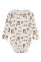 Langärmeliger Body aus weicher, dehnbarer Viskose aus Bambus mit einem Tierprint. Es ist an der linken Schulter und zwischen den Beinen mit Knopfverschlüssen ausgestattet.