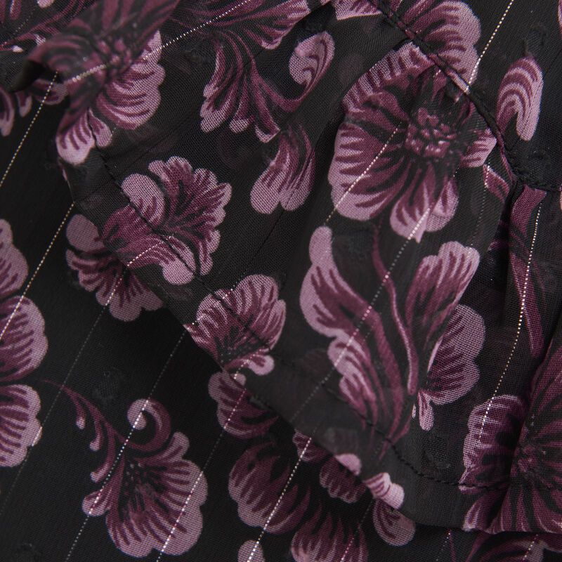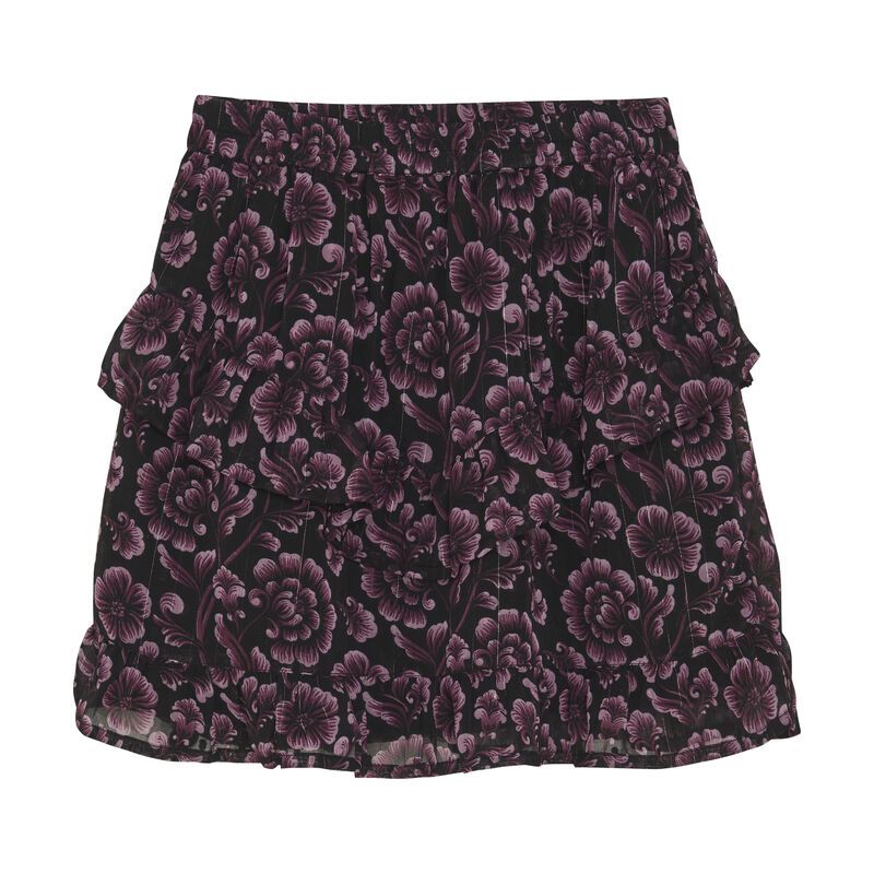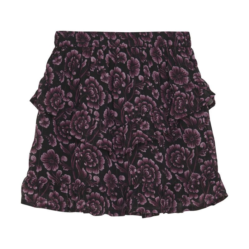 Wunderschöner Creamie-Rock in Schwarz mit Allover-Blumendruck und horizontalen Goldfäden. Der Rock hat ein breites Gummiband in der Taille, damit er dort bleibt, wo er soll, und schöne Falten im Rock entstehen.
