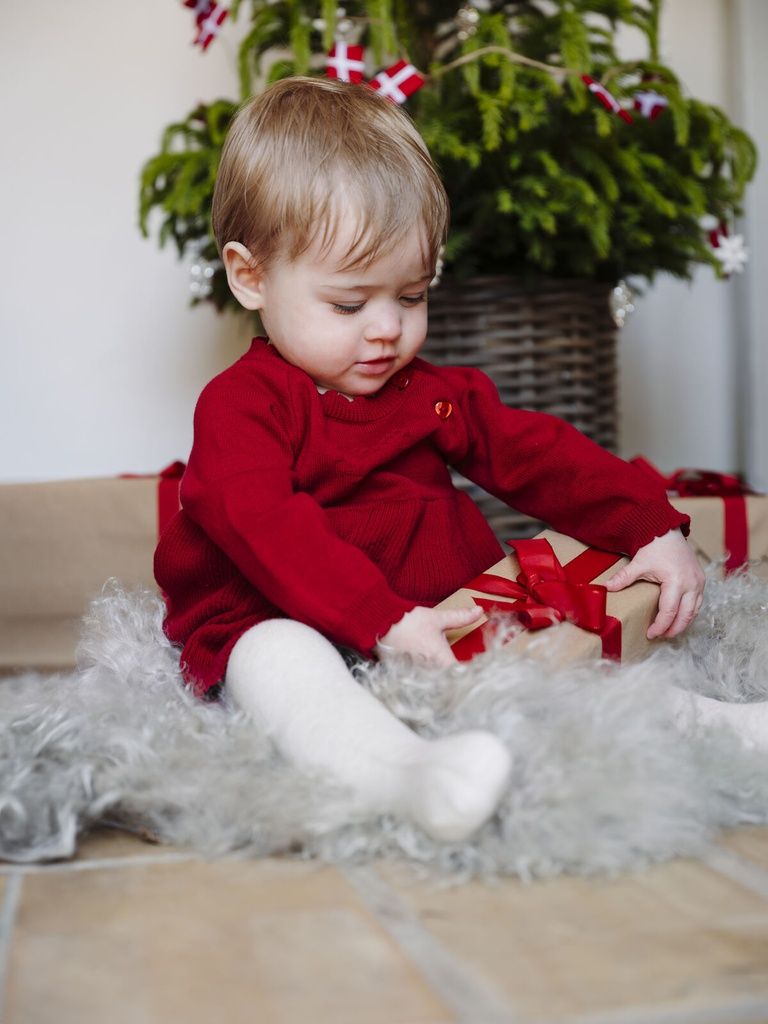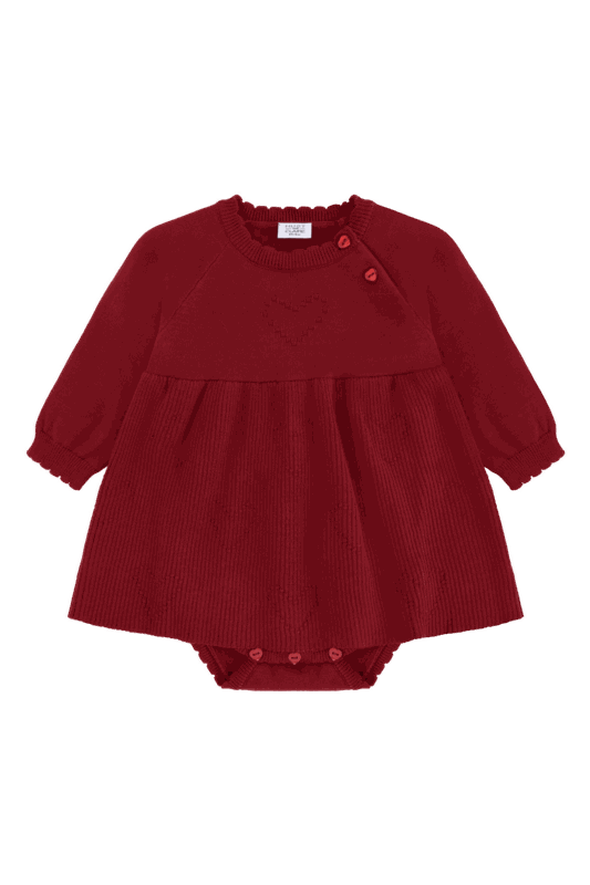 Das Kleid überzeugt durch ein tiefrotes Strickdesign mit feinen Herzchen. Durch die langen Ärmel und den langen Rock wirkt es wie ein elegantes Kleid, bietet aber den praktischen Komfort eines Bodys. Verschlüsse vorne an der Schulter und im Schritt erleichtern das An- und Ausziehen.