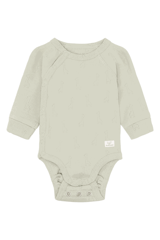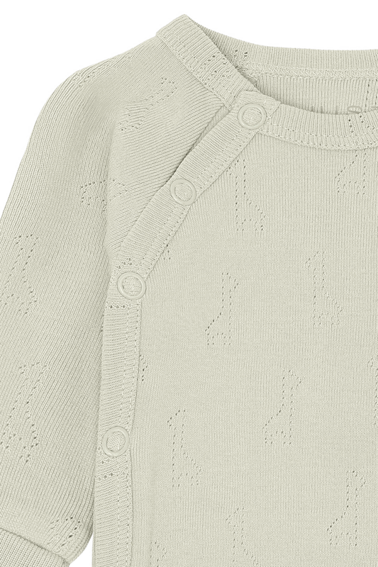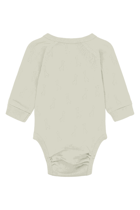 Langarmbody aus weicher Baumwolle mit einem Lochmuster in Form von Giraffen. Dieses Modell verfügt über einen Wickelverschluss auf der rechten Seite und Knöpfe zwischen den Beinen.