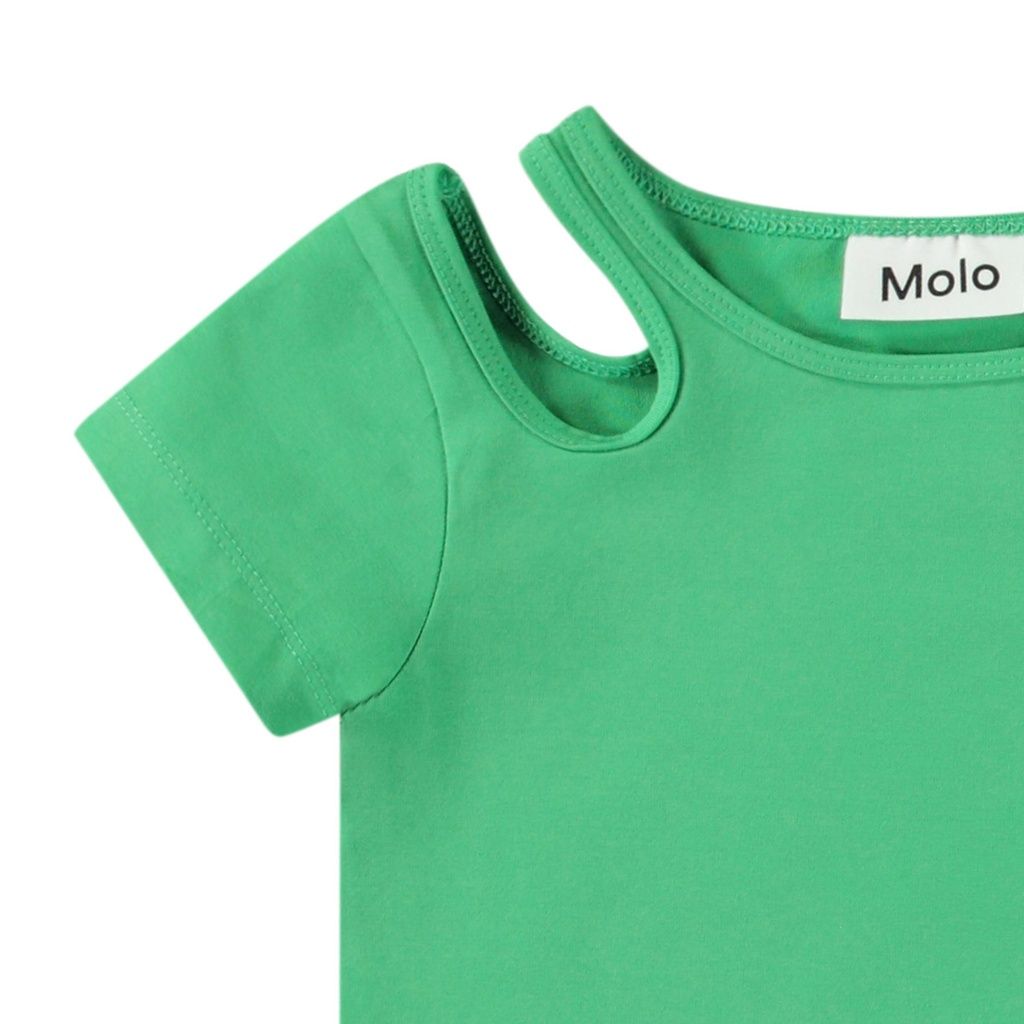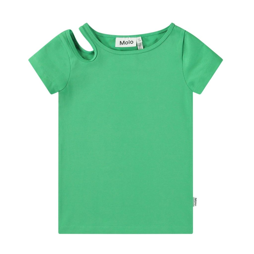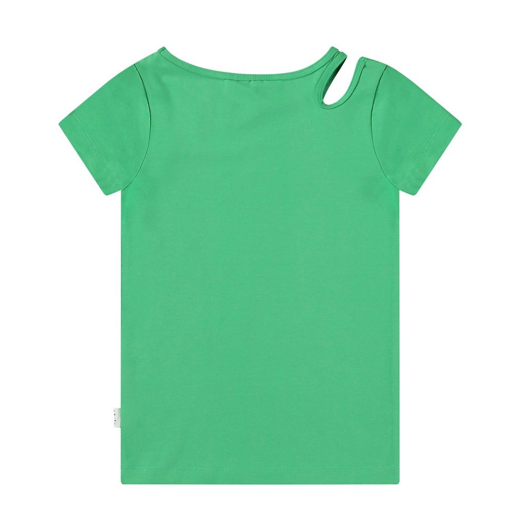 Eng anliegendes grünes T-Shirt aus Öko-Baumwolle mit einem Rundhalsausschnitt und einer Öffnung auf der rechten Schulter, die dem T-Shirt ein schönes Detail hinzufügt.