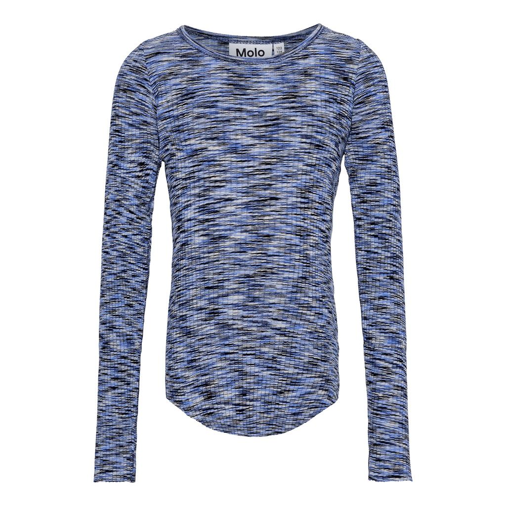Langärmeliges Oberteil aus dehnbarem Öko-Baumwollripp mit enganliegender Passform, Rundhalsausschnitt, rohen Kanten an beiden Ärmeln mit Daumenlöchern. Vertikale Naht in der Mitte des Rückens und eine rohe, abgerundete Kante unten.