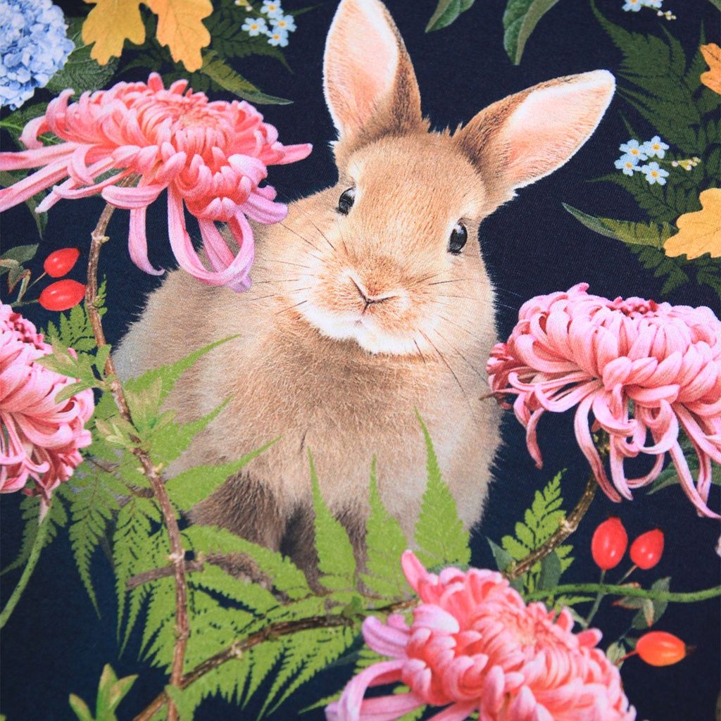 Dieses dunkelblaue Langarmshirt aus weicher Bio-Baumwolle ist nicht nur gemütlich, sondern auch ein echter Hingucker. Der liebevoll gestaltete Print zeigt ein Kaninchen, das von bunten Blumen umgeben ist - ein verspieltes Motiv, das Kinder begeistert.
