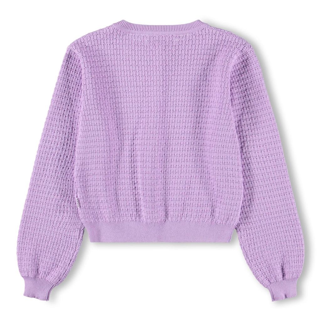Das feine Strickmuster verleiht der Jacke eine elegante Note, während die lockere Passform für Bewegungsfreiheit sorgt. Perlmuttknöpfe und gerippte Abschlüsse an Hals, Ärmeln und Saum runden den Look stilvoll ab.