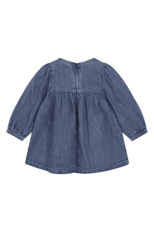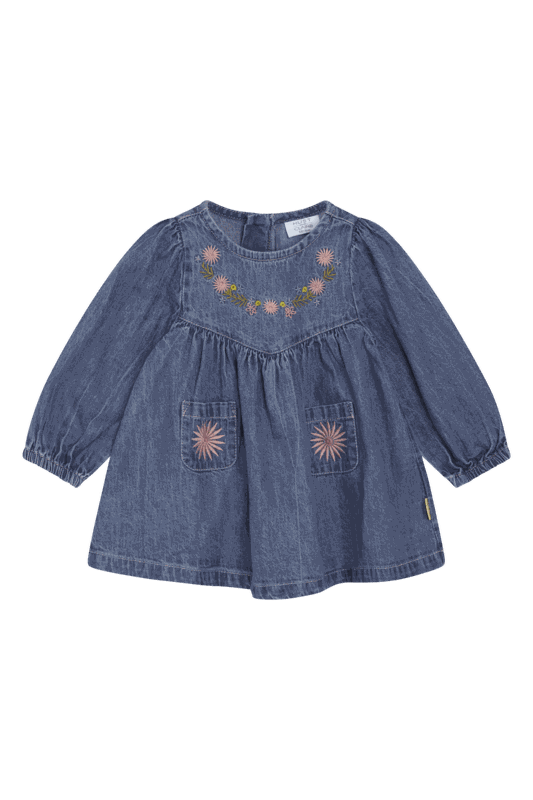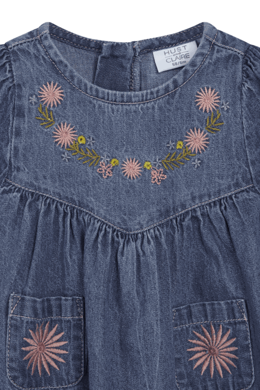 Jeanskleid mit Faltendetails an den Schultern und elastischen Ärmelabschlüssen. Das Modell hat hübsche Stickereidetails auf der Brust und an den Taschen.