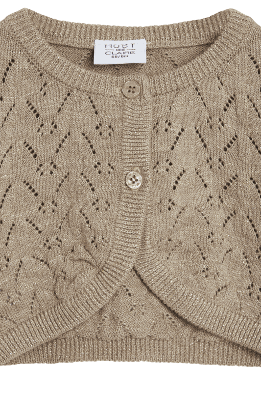 Gestrickter Bolero mit Glitzerdetails und einem Rundhalsausschnitt. Dieses Modell hat ein Faltendetail an den Schultern und Knöpfe vorne.