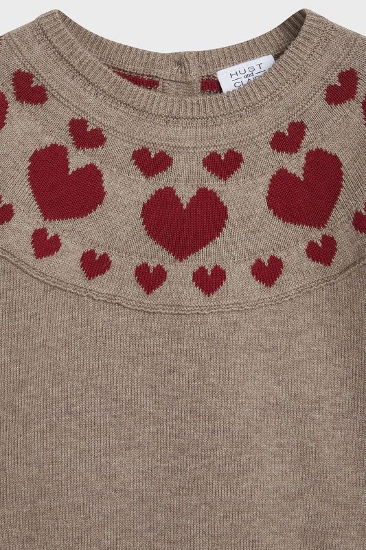 Strickkleid aus weicher Baumwolle und mit einem Rundhalsausschnitt. Dieses Modell ist oben und unten mit Herzen und an den Ärmeln mit Rüschenbesatz versehen.