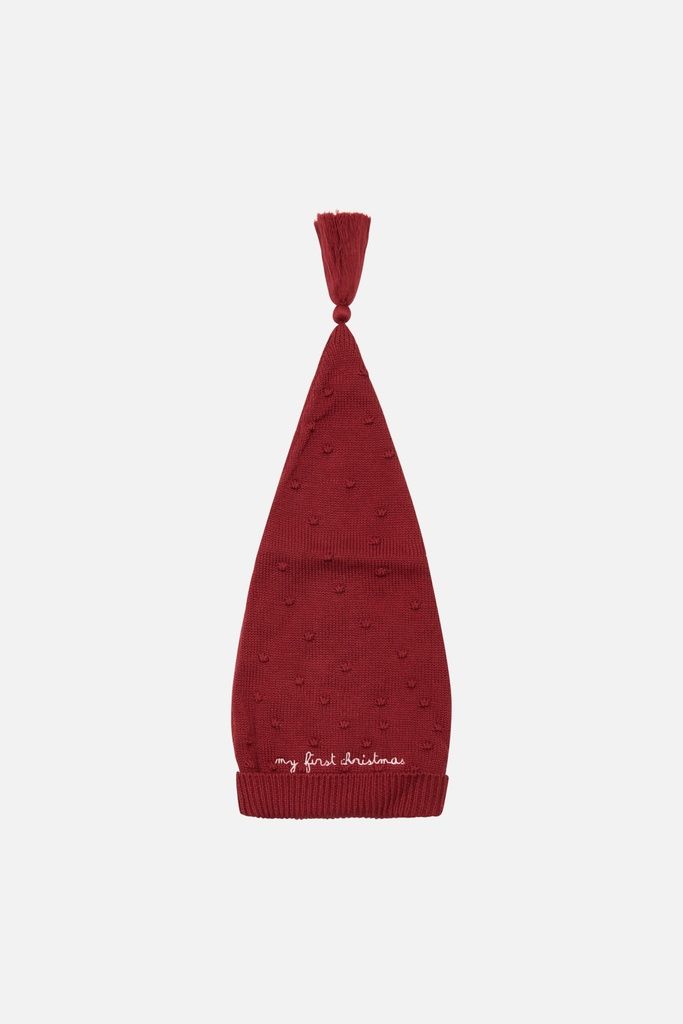 Gestrickte Mütze mit kleinen Tupfen und einem Pompon am Ende. Auf der Unterseite der Mütze ist "My First Christmas" aufgestickt und der Saum ist gefaltet. Das Produkt ist aus 100% Bio-Baumwolle hergestellt.