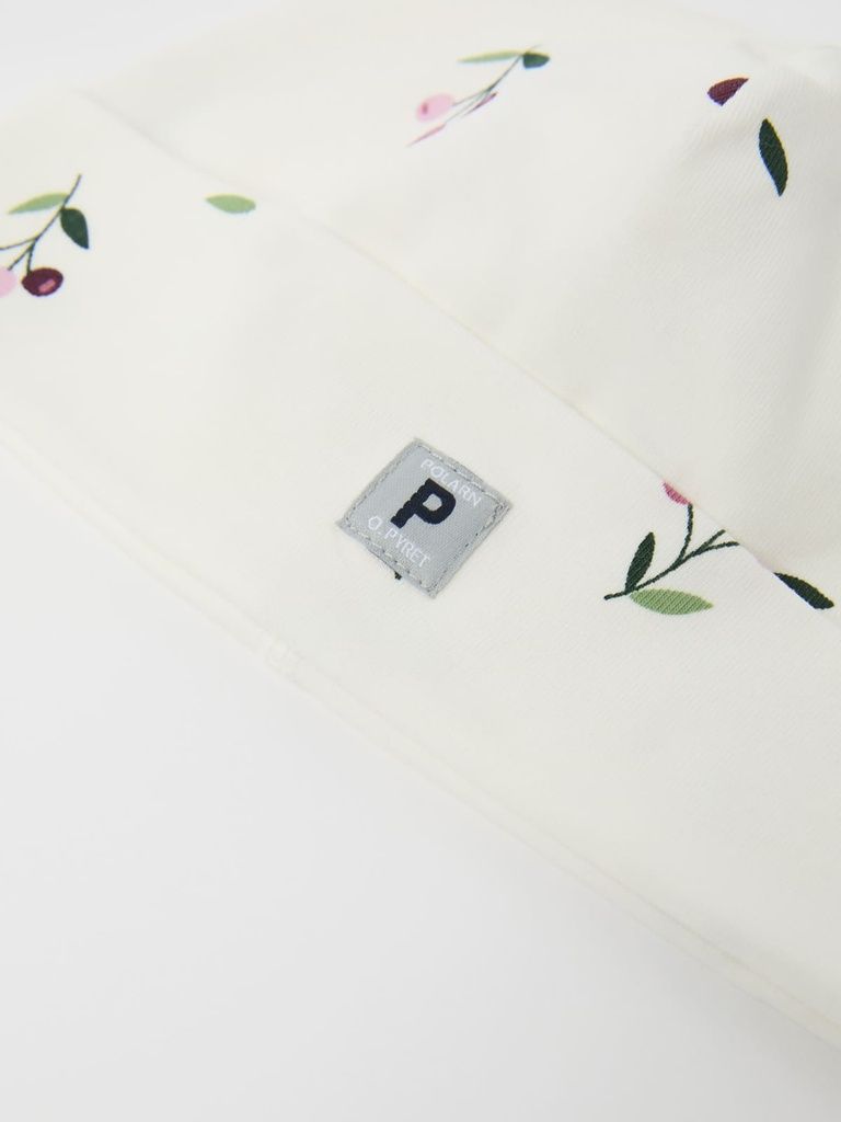 Superweiche Erstlingsmütze für Babys aus 100 % Bio-Baumwolltrikot, die durchgehend mit kleinen Blumen bedruckt ist.