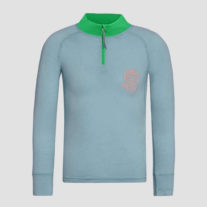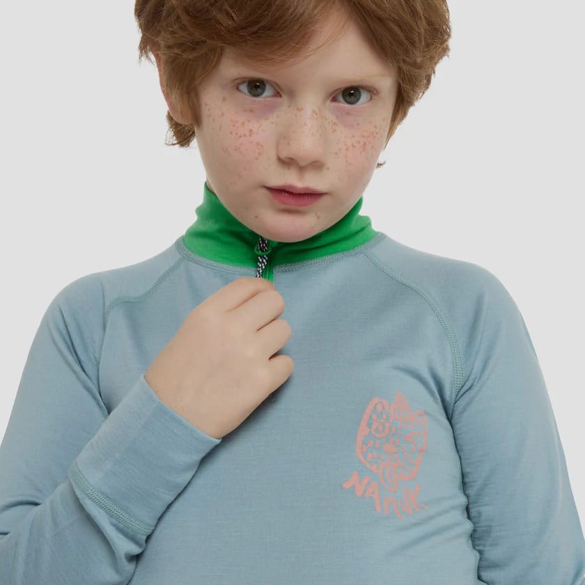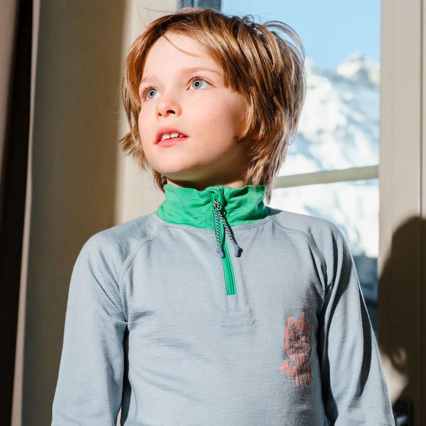 Das Honu Langarmshirt für Kinder kombiniert Funktionalität und Komfort für kleine Abenteurer. Inspiriert vom klassischen Innerschweizer „Gnägi“-Shirt, verfügt es über einen hochgeschnittenen Kragen und einen kurzen Frontreissverschluss, der leichtes An- und Ausziehen ermöglicht - ohne dass ein Schal nötig ist.