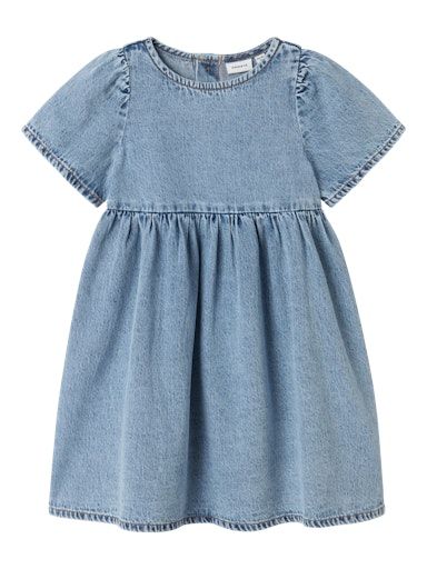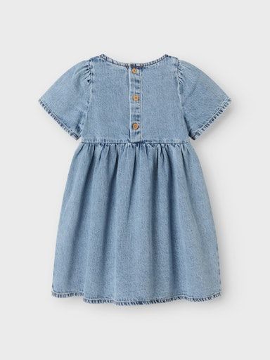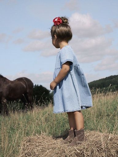Dieses süsse Kleid aus recycelter Baumwolle bringt frischen Wind in jede Kindergarderobe! Der robuste Denimstoff sorgt für Langlebigkeit, während die zarten Falten, der verspielte U-Ausschnitt und der Knopfverschluss mit Schlaufe liebevolle Details setzen. Kurze Ärmel machen es zum idealen Begleiter an sonnigen Tagen – ob im Alltag oder zu besonderen Anlässen.