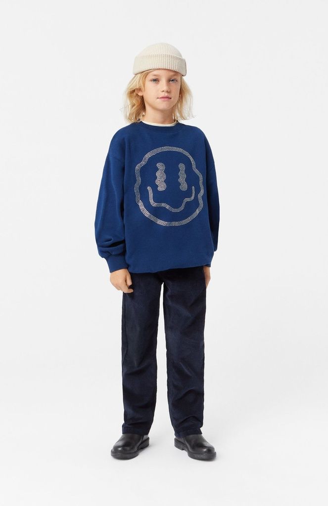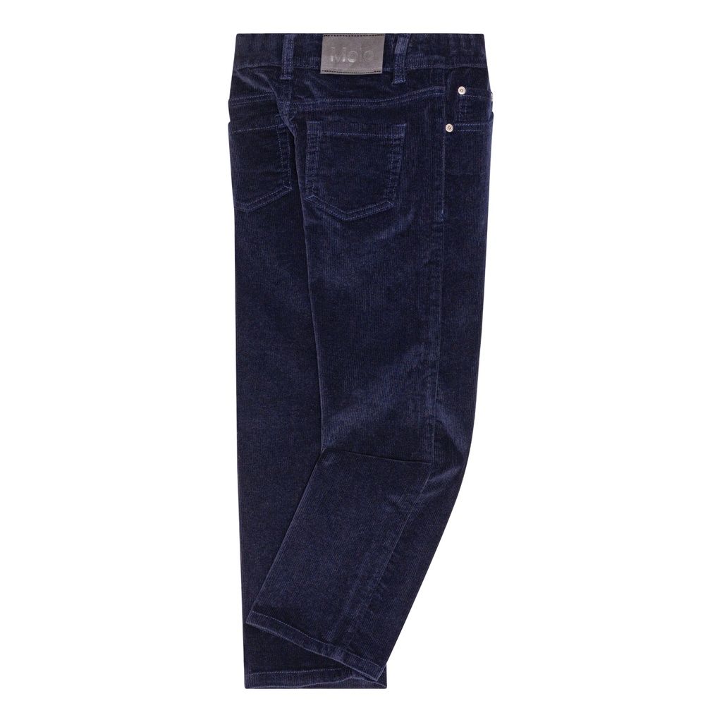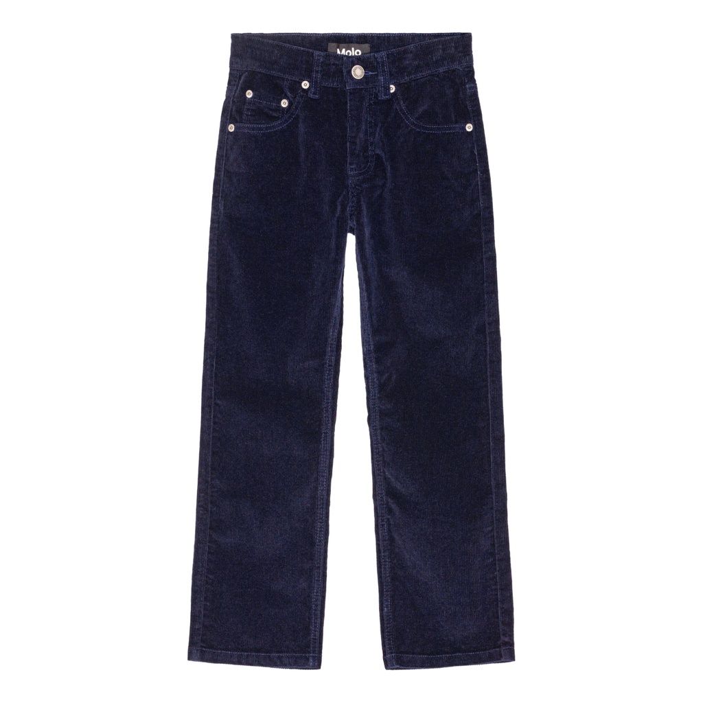 Dunkelblaue Hose aus geripptem Samt mit Taschen und Gesässtaschen.